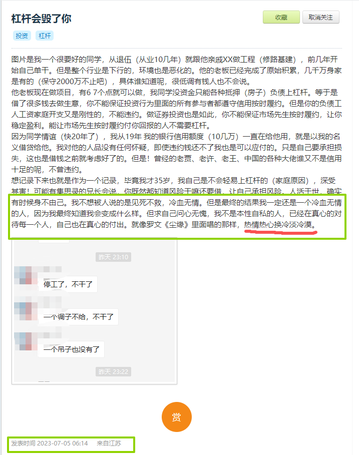 本来想把同学负债的事情放到以前帖子下的,长时间不更新不能更新了。周四打我微信视频、电话,毫无疑问借钱救火,我直接没接。就像我当时文章里面说的,我最终会变成一个冷血无情的人,我没有接电话,我的理解就是无底洞不如彻底暴雷老赖即可,我不想被拖下水。这2天见面也如我结尾说的:热情热心,换冷淡冷漠。