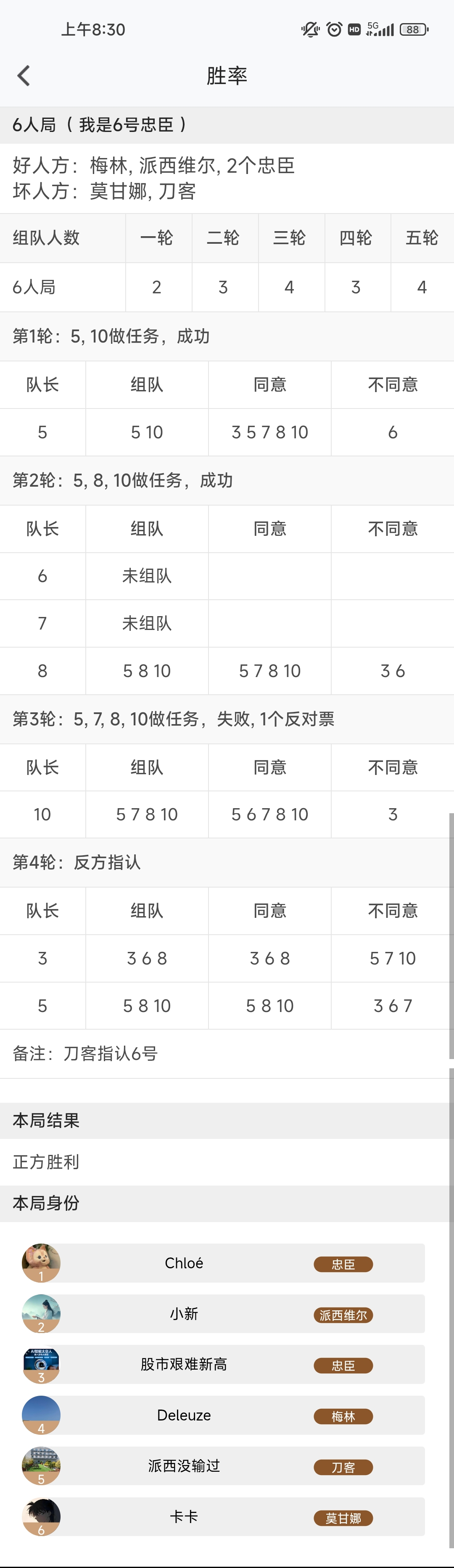 - 2号忠臣:因情绪化反对梅林组队,间接帮助反派推动炸车。 - 4号刀客(队友):前期犹豫(未炸第二轮),但后续炸车关键轮次起到作用,尽管配合略显保守。