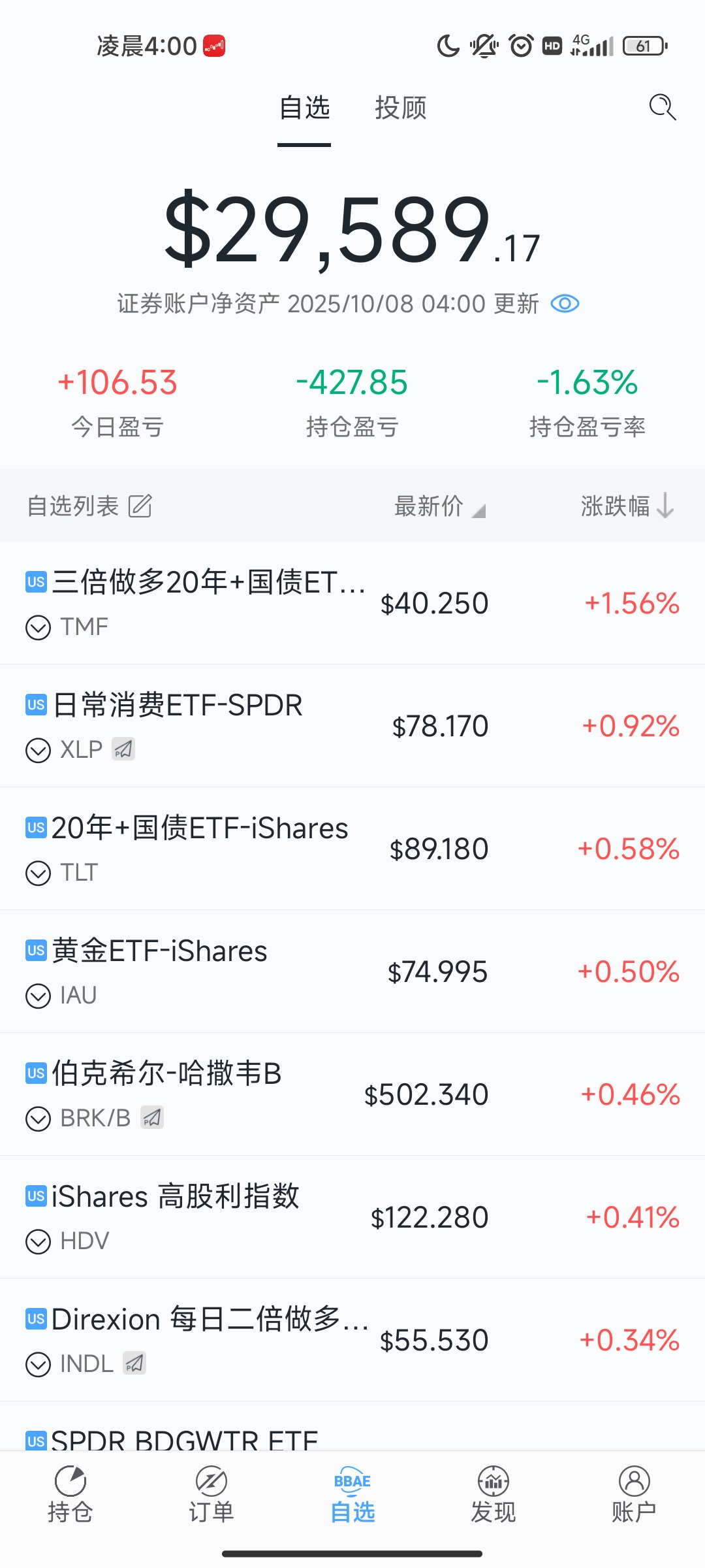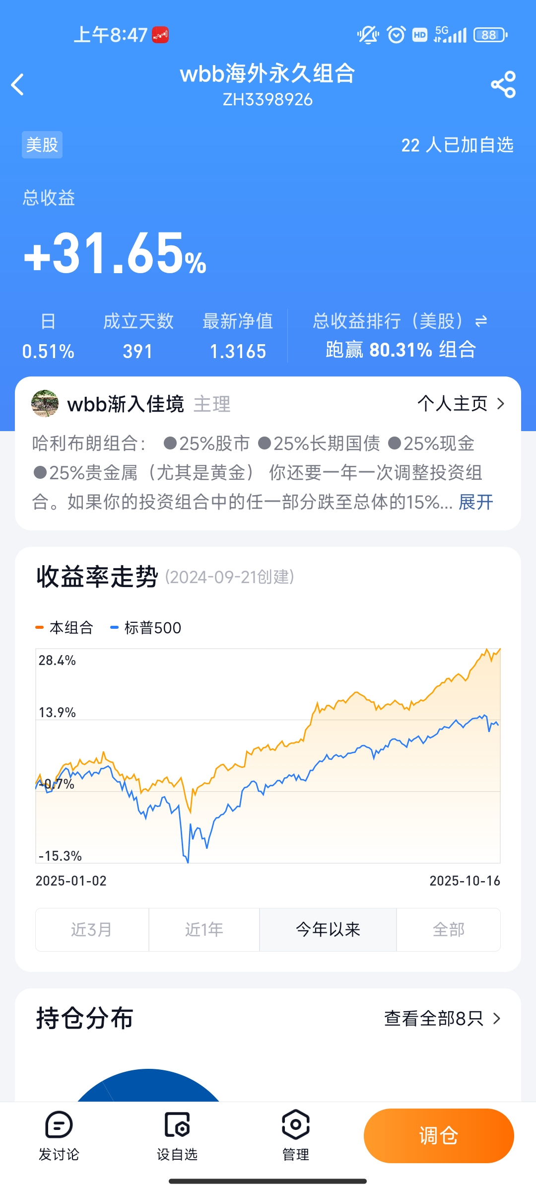 3月:开始有意识的超配【稳定价值】【高股息】的股票,这个决定奠定了我后面几个月超越我所有拜过的老师。这个月我开始拿出来3000块钱赌了一把末日轮,结果当天就输光了,后面5月份又入了3000元做买方又亏光了,不玩了,后面再也没充过钱。月初几天,我发现每天都是从赚1万变成赚1千。小市值最高亏50%,我疯狂把高股息的股票当做血包去加仓小市值策略,到3.11小市值策略还亏16%。月中开始慢慢把之前丢失的高股息/稳定价值/可转债/QDII买回来,回归多策略。上个月我花30万定期3个月存款得到办理恒生银行卡的机会,这个月香港卡办理下来了,第一次国际汇款啥都不懂,怕被外汇管理局问东问西,就使用了大家推荐的熊猫速汇汇了第一笔5万RMB,其实后来发现熊猫速汇最坑,他们把他们公司应该挣的钱都从换汇损失里拿到了。3月份渐入佳境,几乎每天都是红的,只不过涨的很少。5万港币到账后,通过崔文泰的链接开通了华盛通证券,我终于迈出了出海第一步,然后我就开始了在美股做t的赚钱时光,玩了很多在注销老师公众号里总结的一些杠杆ETF(如tqqq/tmf)/伯克希尔/coin/emxc/tlt/inda/trmd等等,做t很适合美股,不怕被套。