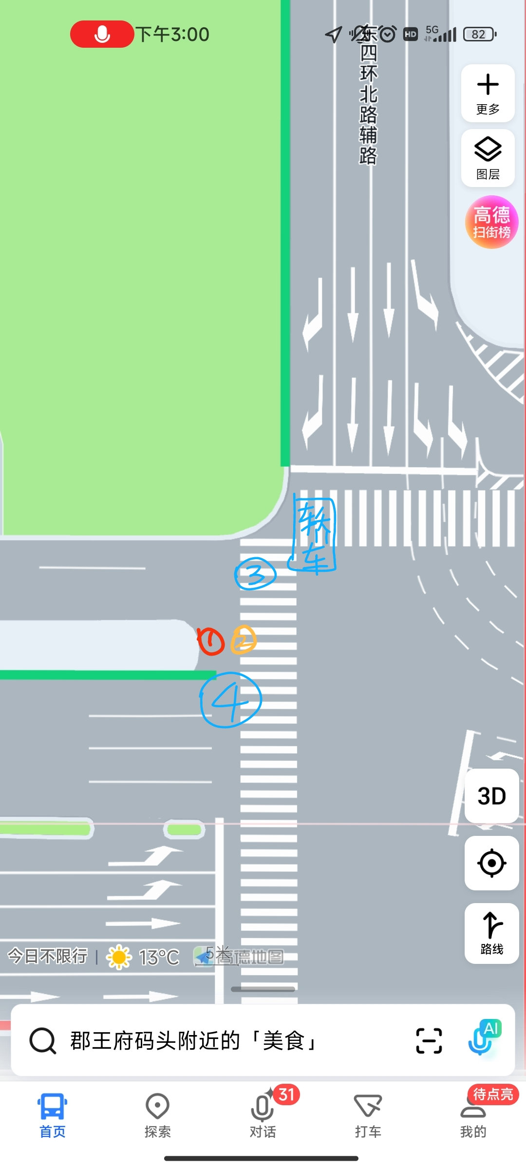 路上路过朝阳公园桥的时候,我把电车停在红色①号位置等南边的红绿灯,后来是又来了一辆电动车2号停在我旁边,我没有注意他是什么时候听我旁边的。