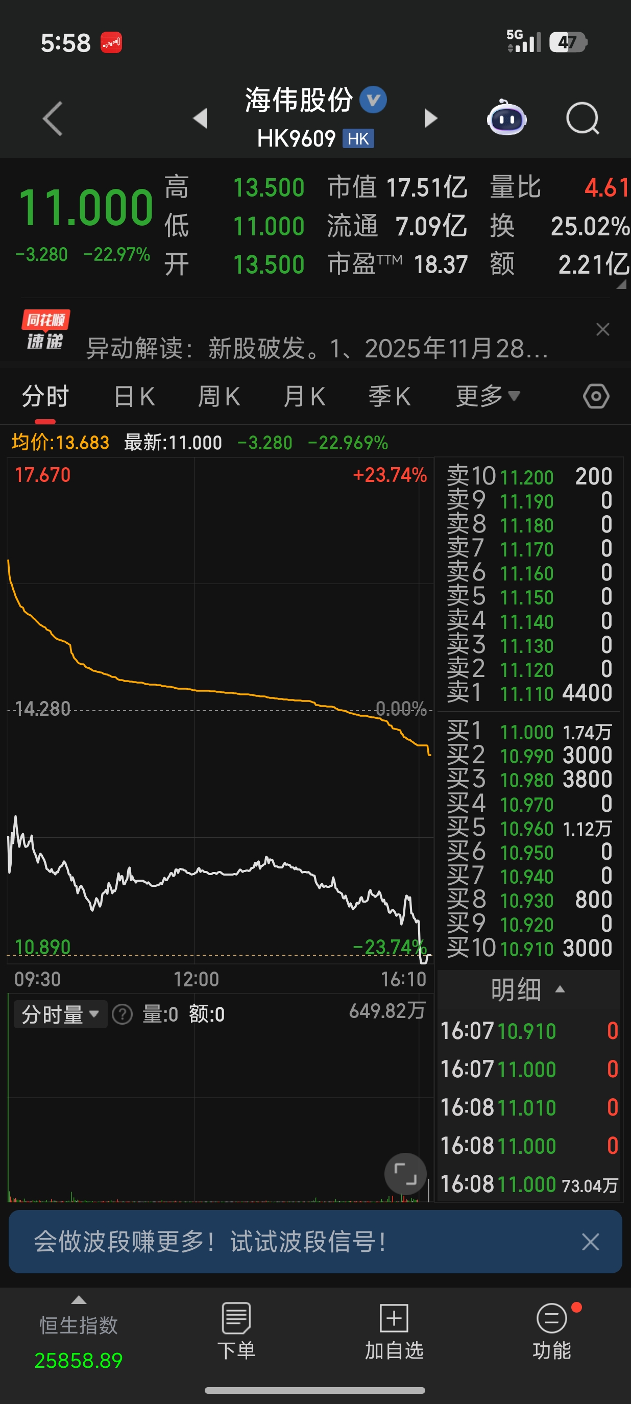 海伟股份(09609.HK)于2025年11月28日上市首日破发,收盘跌幅达23.74%。该股发行价为14.28港元,上市首日最低触及11.00港元,最大跌幅超22%。此次破发打破了港股新规后B机制新股不破发的记录,引发市场关注。分析认为,破发主要源于国际发售认购倍数较低(仅6.11倍)、绿鞋机制失效以及暗盘阶段散装国配抛售等因素。此次破发对后续港股打新策略产生影响,投资者需更加关注公司基本面而非单纯依赖认购倍数