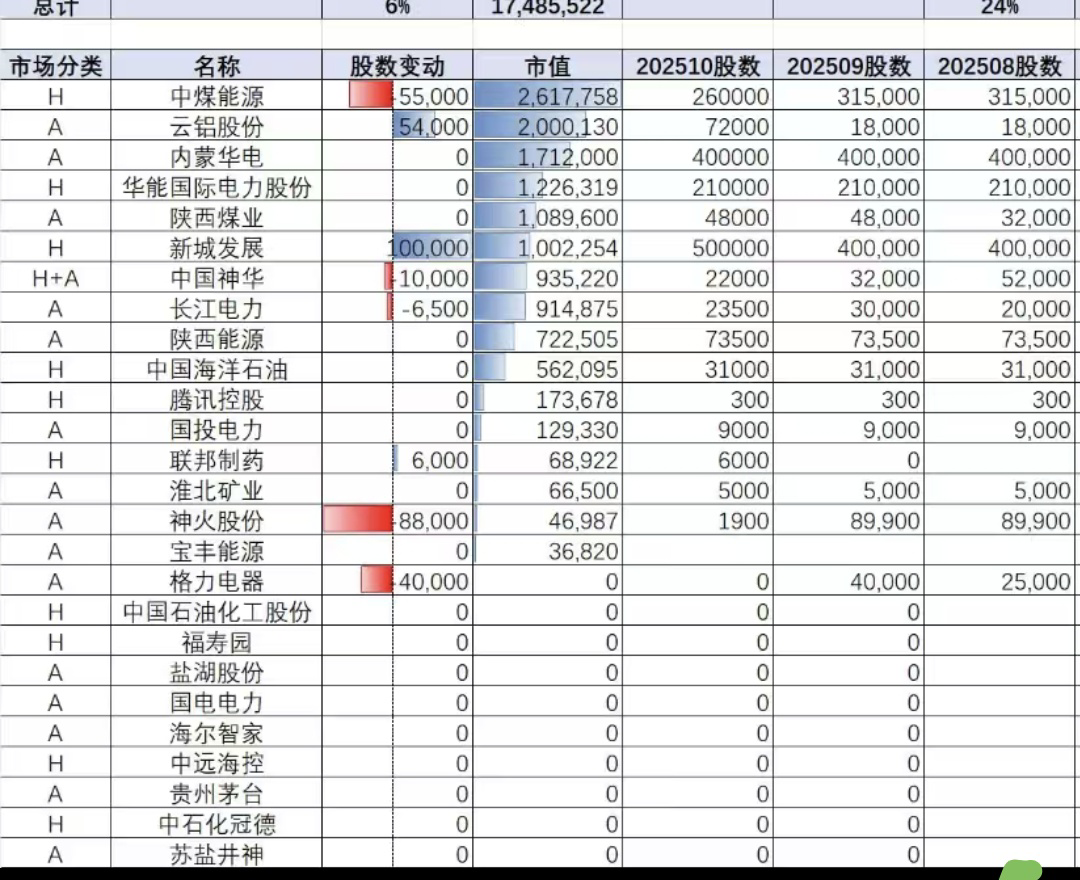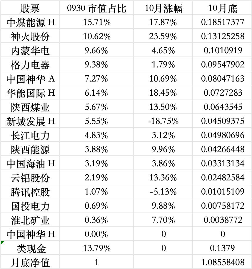 说实话,你这吐槽公公是没有道理的。 公公 9 月底的数据已经给你了,你都懒得整理一遍再讨论。第一张图是网友整理的,第二张图是我简单整理的,你就是拿着 9 月底的持仓不动,10 月的涨幅都有接近 8.5%。