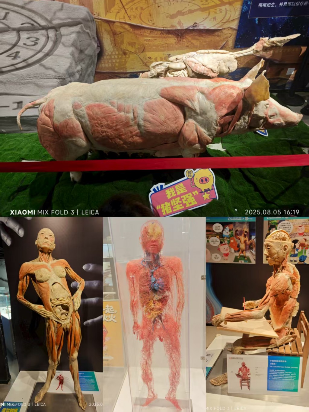 本周亲戚家的小孩来访,所以每天收盘后我都会带他们出去逛一圈。不过成都的天气还是那么热,所以游玩只能以室内为主了。比如周二我们去的就是天府广场地下的生命奥秘博物馆。这里有很多值得一看人体标本,比如腹中有胎儿的公主(下图左下)、只保留人体全部血管的大红人(下图中下)以及脑洞大开的画家(下图右下)等。它们不仅有科普价值,当作艺术品来欣赏也是颇具表现力的。不过最让我惊喜的是看到了老朋友猪坚强的遗体(汶川地震中被埋36天幸存的家猪,后来在建川博物馆活到了14岁)。除了猪坚强,我的动物朋友白鳍豚琪琪、红毛猩猩特里等都已去世多年,并被做成了标本。我的眼前突然突然出现了这样一幅画面:若干年后,我的遗体也被博物馆做成塑化标本《中国股民》,呆呆坐在电脑椅上的我,曲面屏特制的眼镜上不断地闪现着指数、K线图、股票论坛等等画面。哈哈,是不是有趣得很呢?