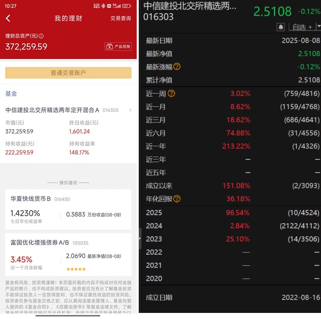 记得这个账户当初我是全仓申购了25万元的016303——中信建投北交所两年定开。