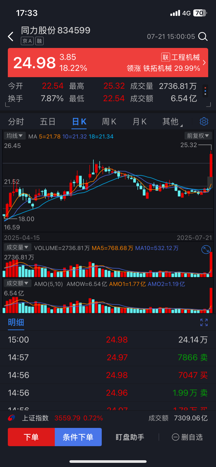 市场仍然较强。今天我打开了尘封多年的期货账户,在平盘附近买开了一手IF2507试试水,相当于持有了117万的300ETF。这样算下来,我基本就没怎么减仓了。