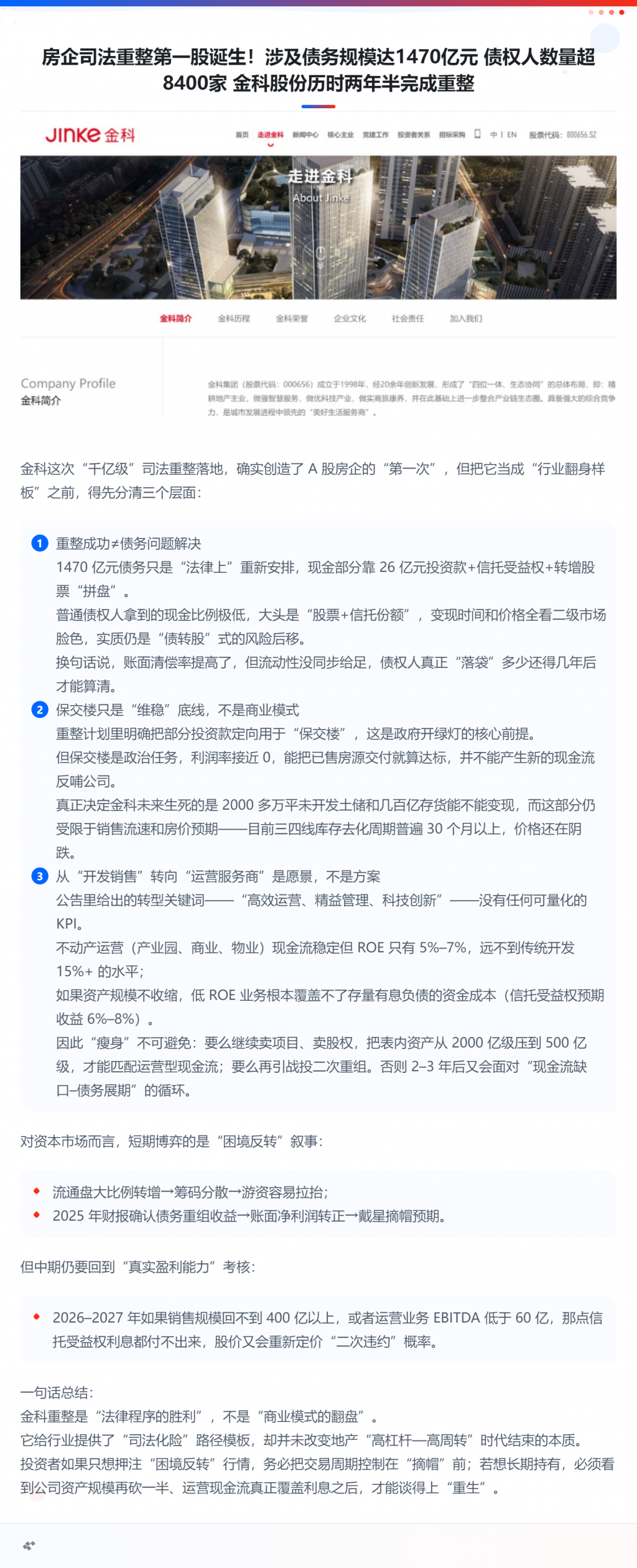 1. 重整完成公告:金科股份成为全国首家通过司法重整化解风险的千亿级上市房企2. 重整历程:历时两年半,涉及1470亿元债务、8400余家债权人
