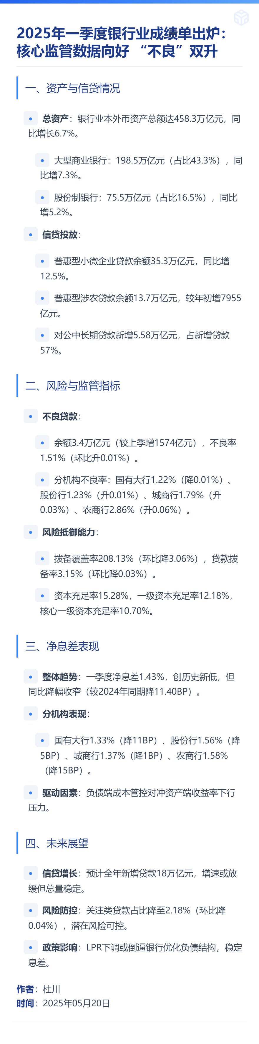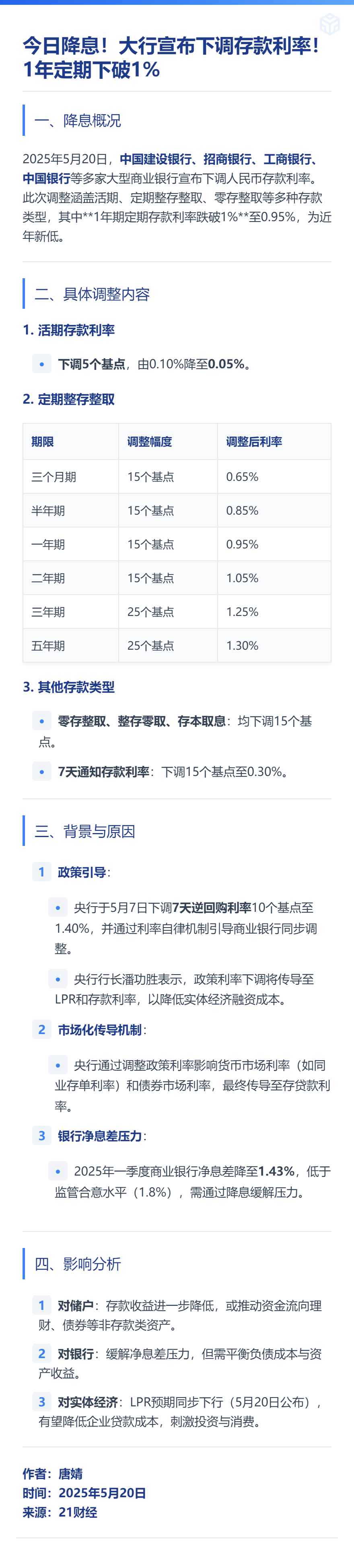 2025/5/20 1年期LPR降至3.00%,5年期以上LPR降至3.50%,均下调10个基点,首套房贷利率进入“2时代”。多家银行下调活期、定期及大额存单利率,大额存单迈入“1时代”。