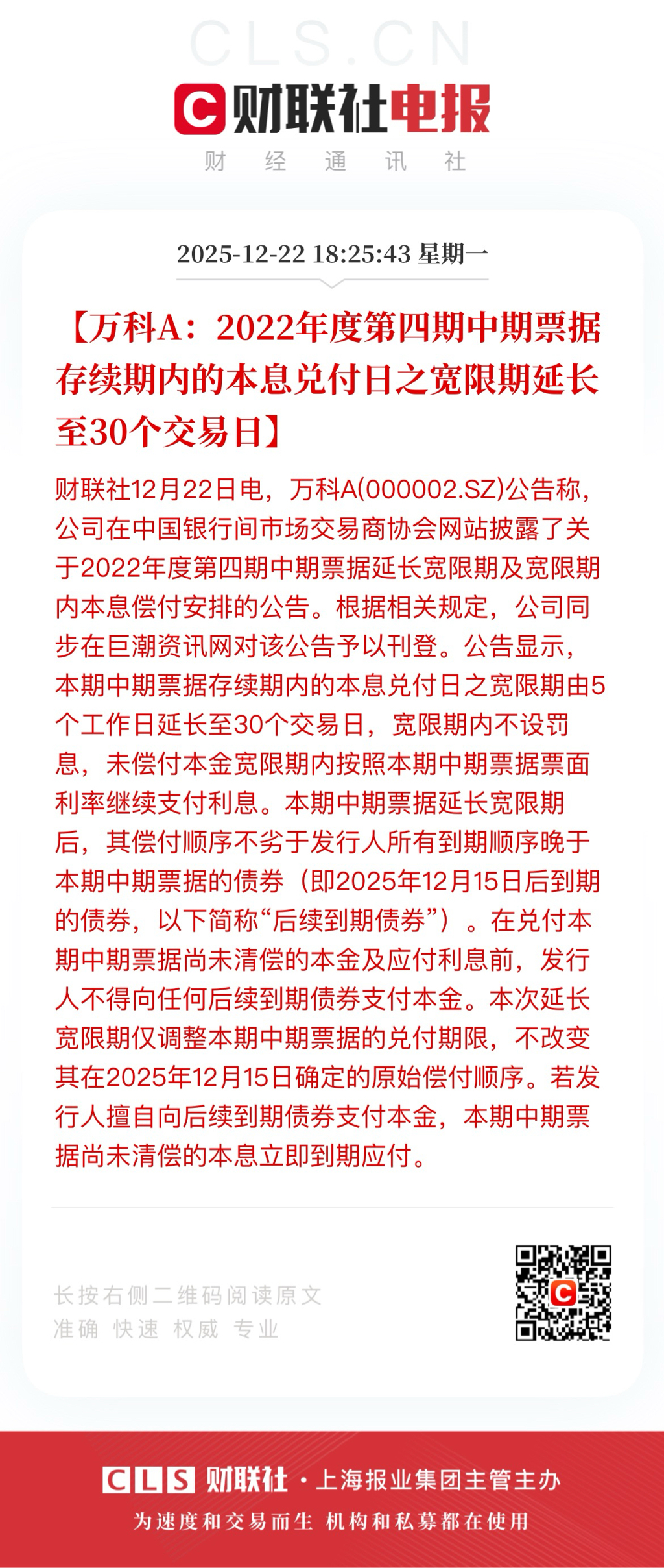 12 月 17 日上清所挂出的“22万科MTN005”议案明确把 37 亿元本金推迟到 2026 年 12 月,票面利率维持 3% 且不计复利——这是标准的技术性违约(extension without compensation)。如果深国资真兜底,最合乎逻辑的做法是“代付或注入资金→按期兑付”,而不是让持有人投票展期。市场第一次吃到“官方默许展期”的瓜,信仰瞬间塌方。