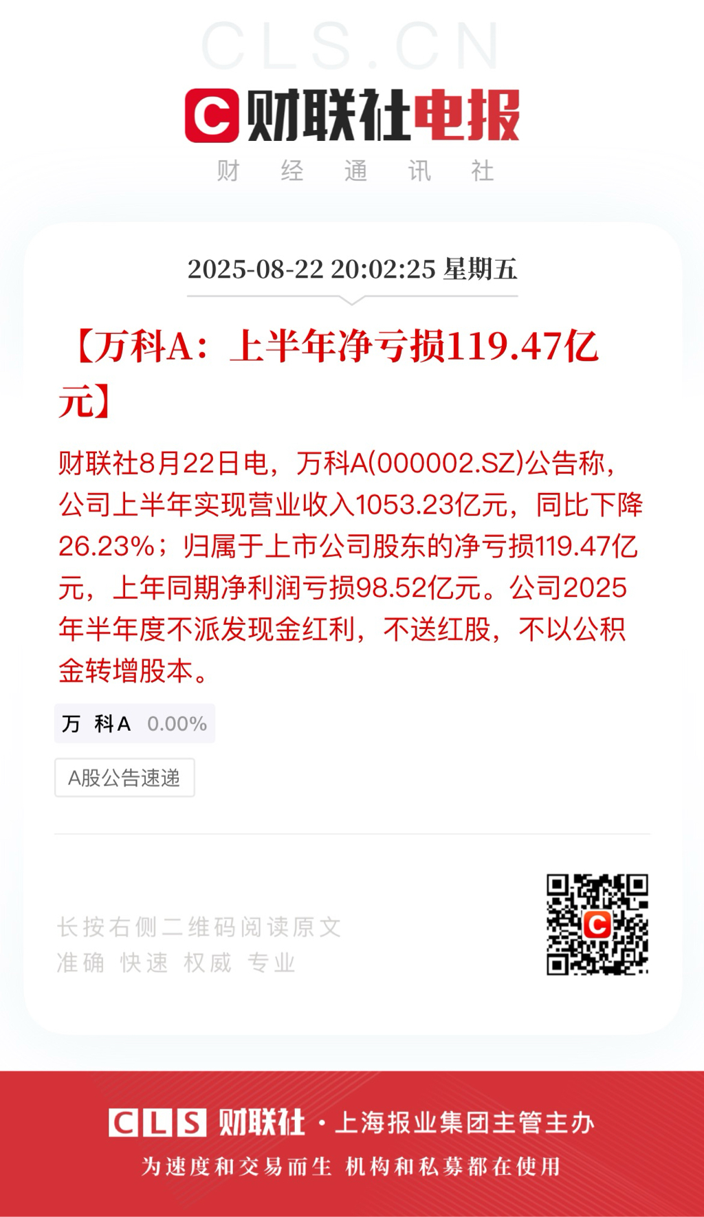 2025/08/22 万科A:上半年净亏损119.47亿元】财联社8月22日电,万科A(000002.SZ)公告称,公司上半年实现营业收入1053.23亿元,同比下降26.23%;归属于上市公司股东的净亏损119.47亿元,上年同期净利润亏损98.52亿元。