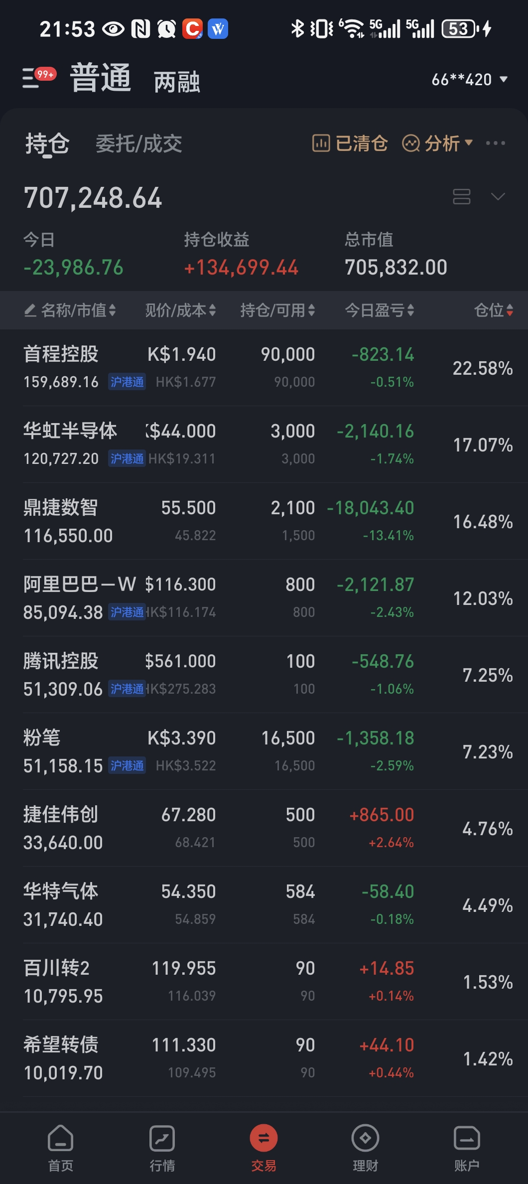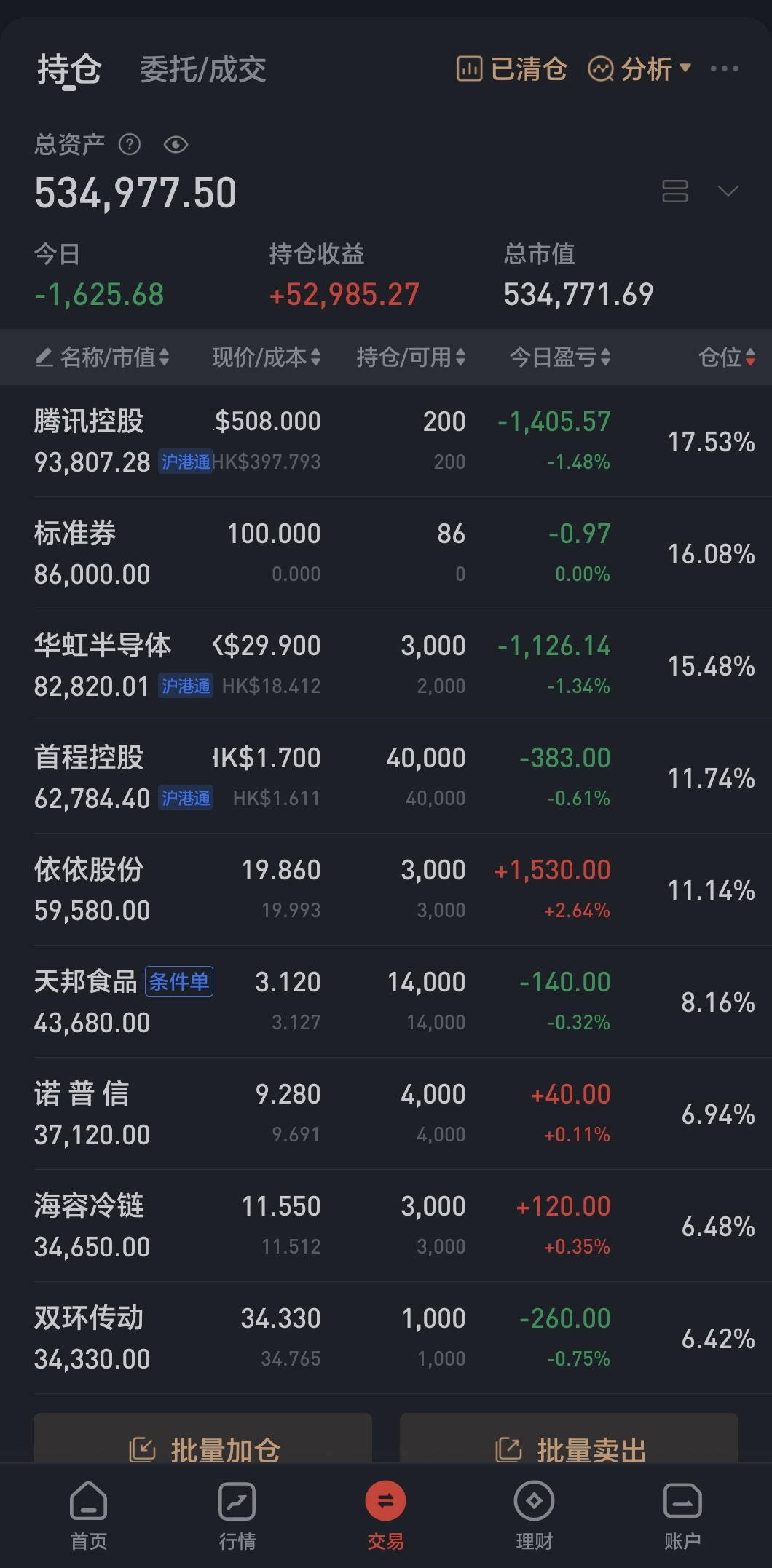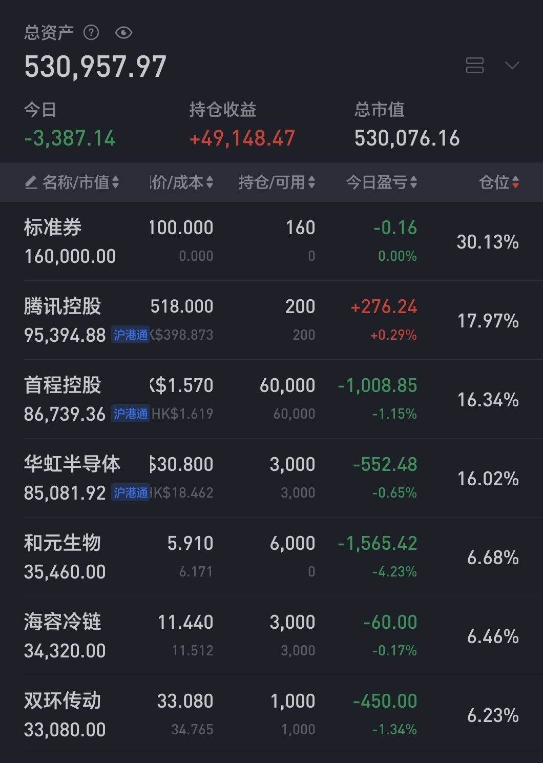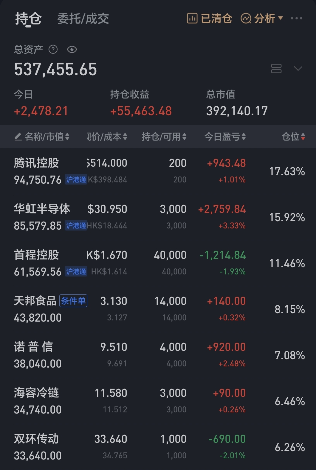 今日无操作,仓位约7.7成。持仓的腾讯小幅回血,分众和华虹H小幅回落。