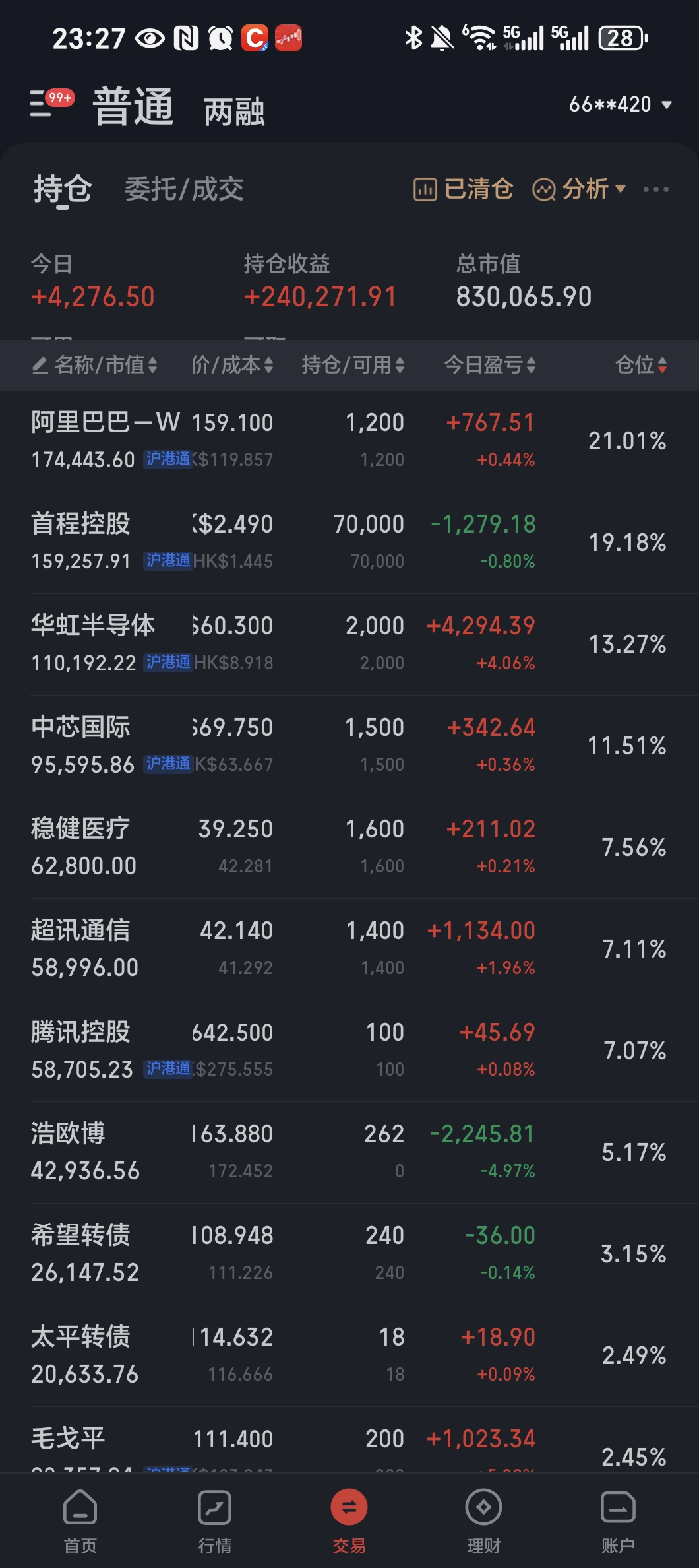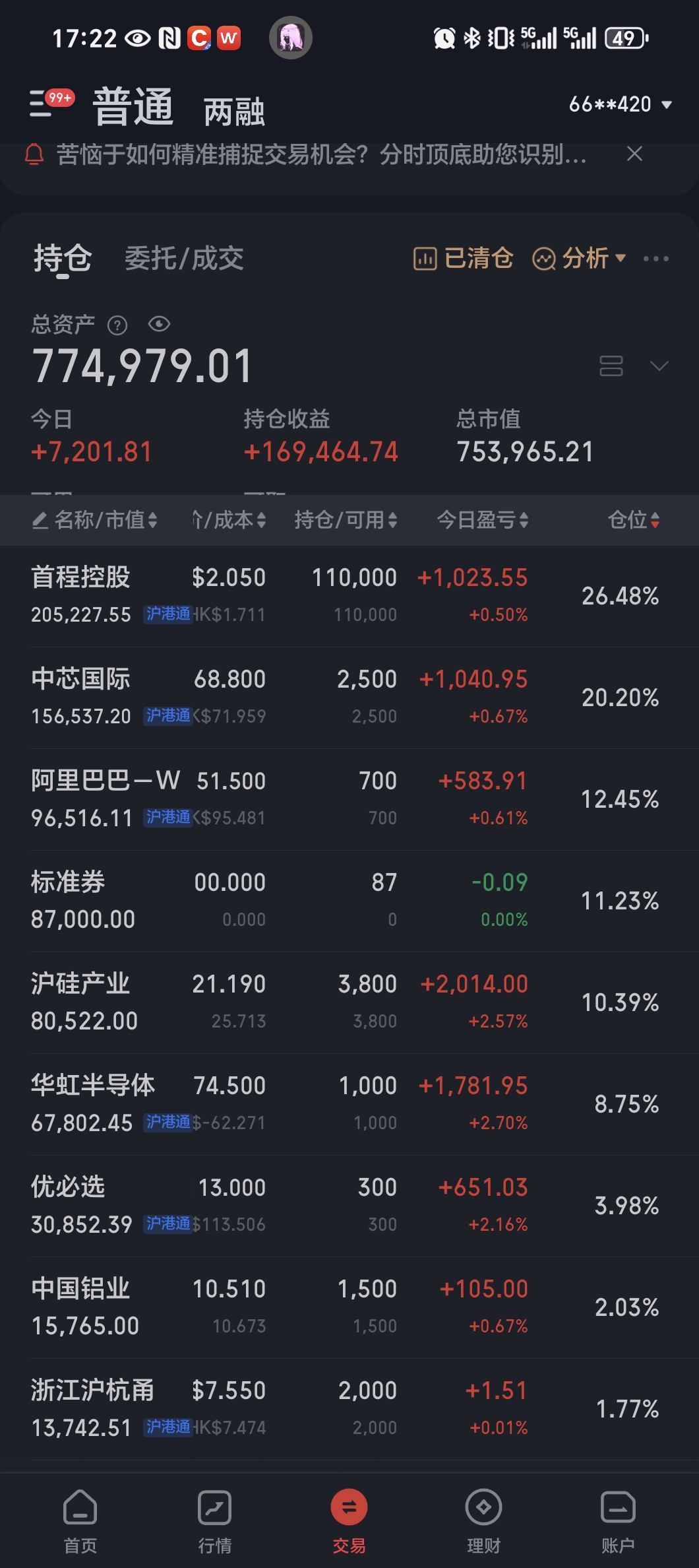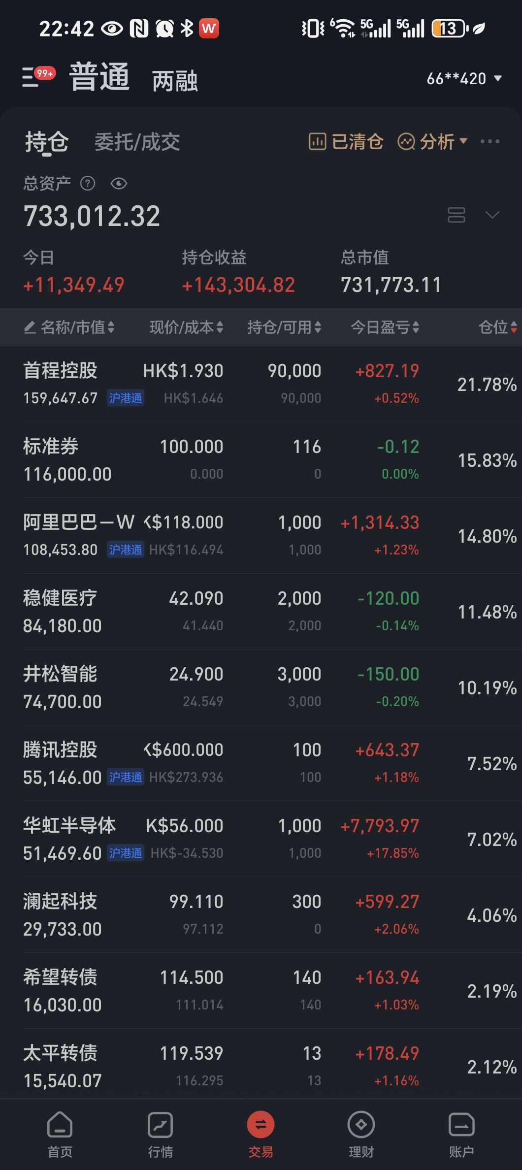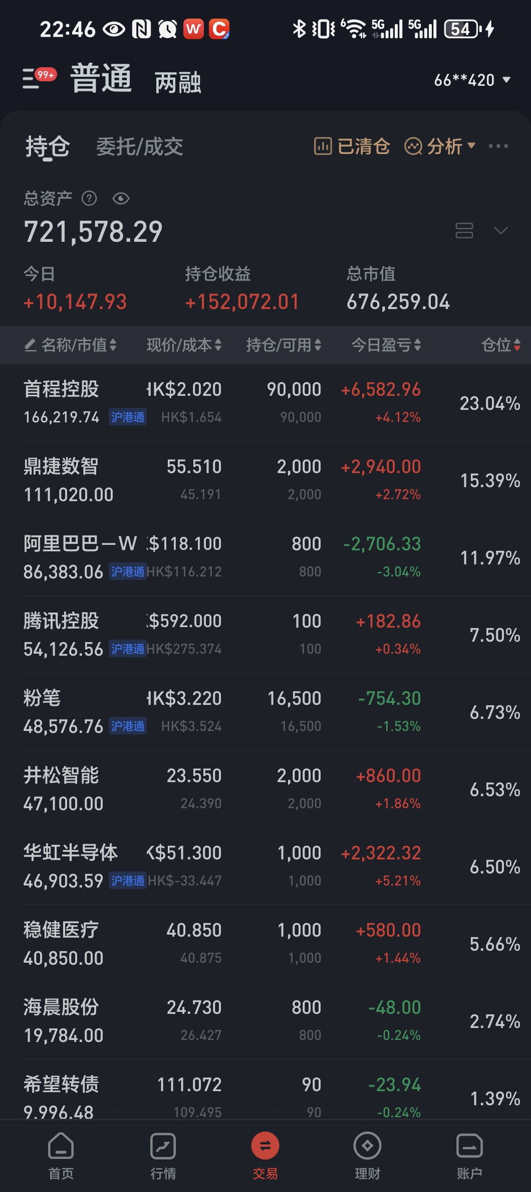 今日无操作,仓位约7.7成。持仓的腾讯小幅回血,分众和华虹H小幅回落。