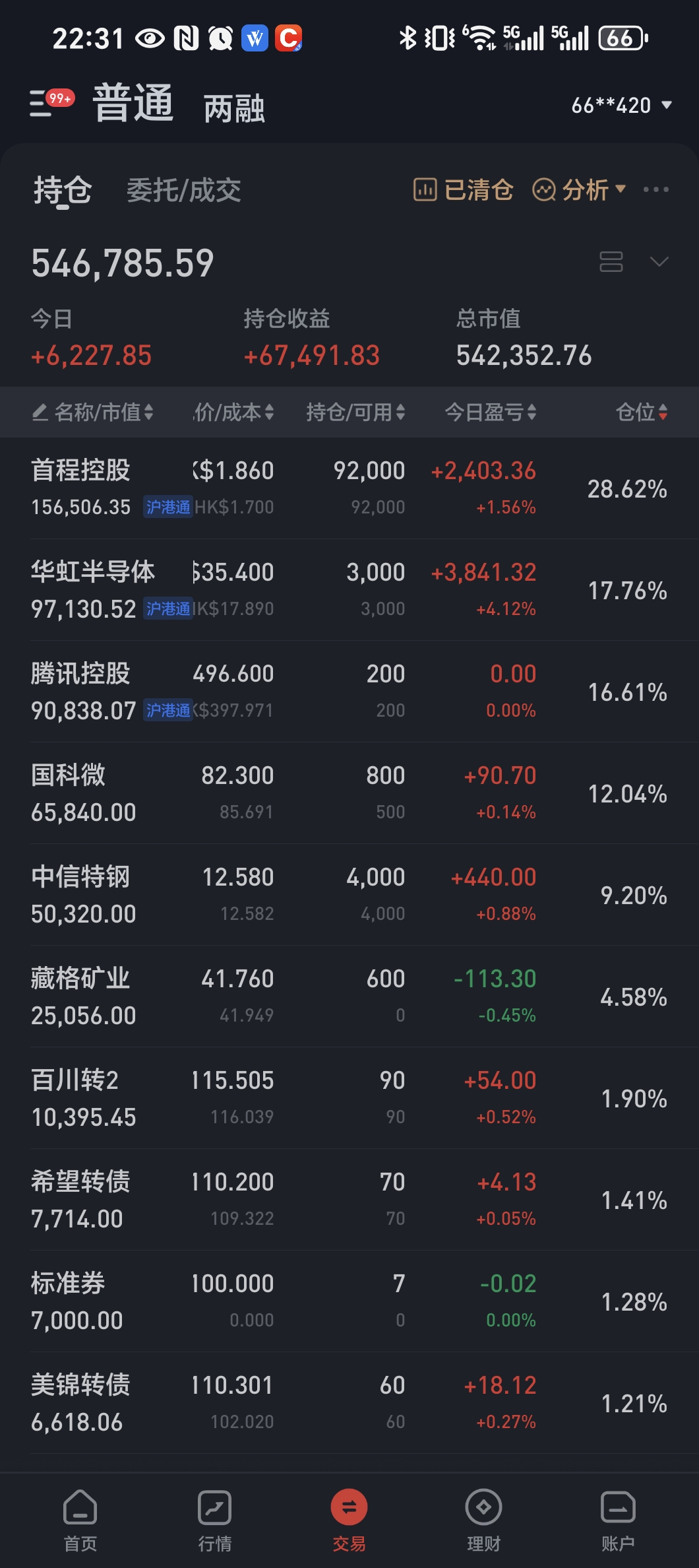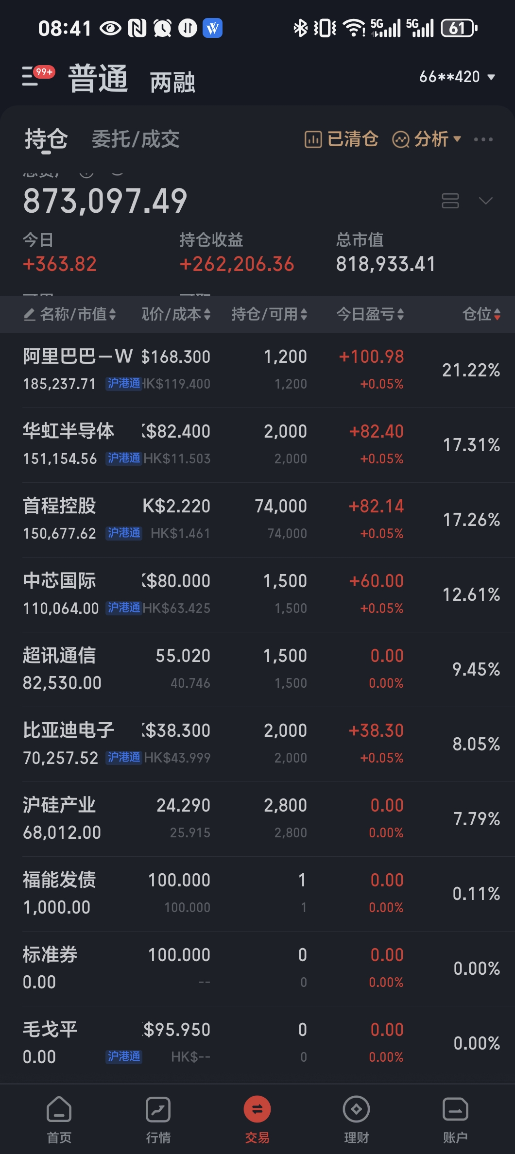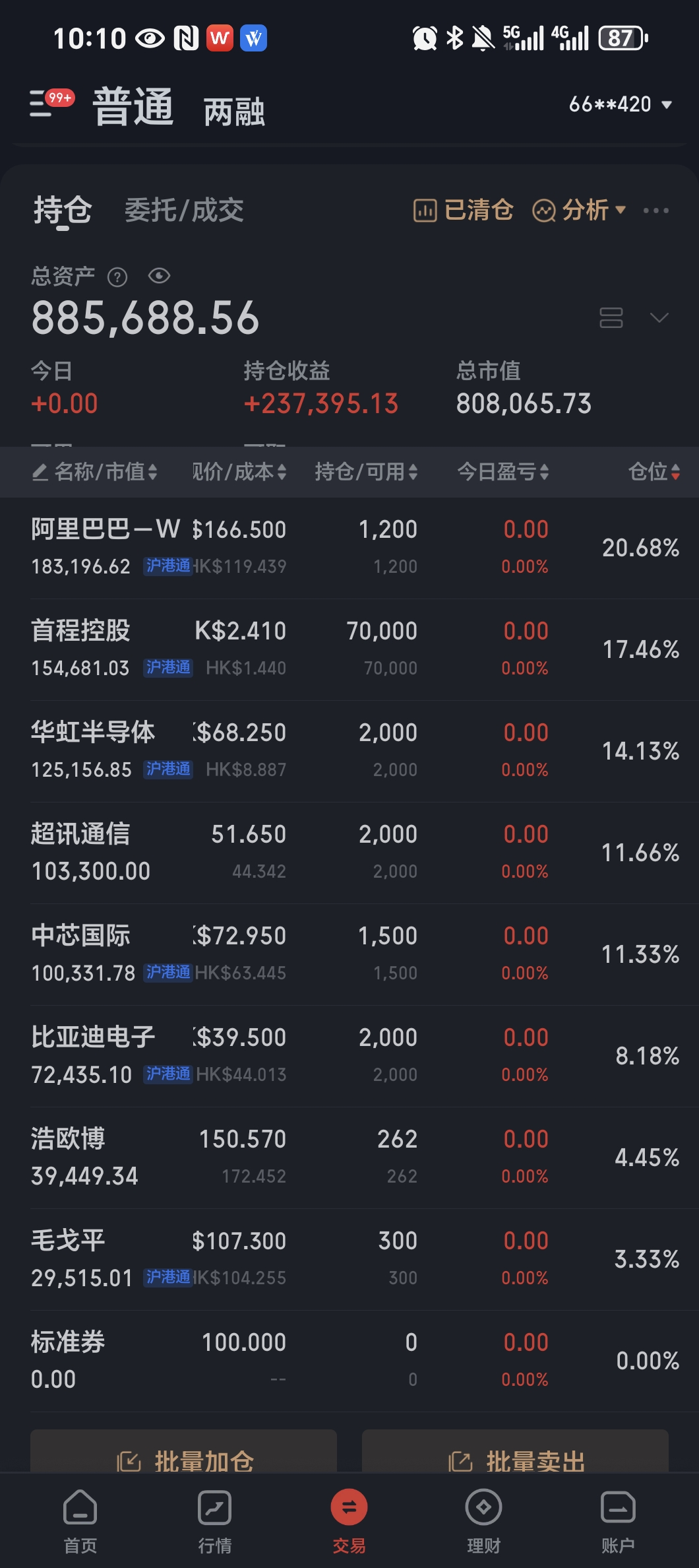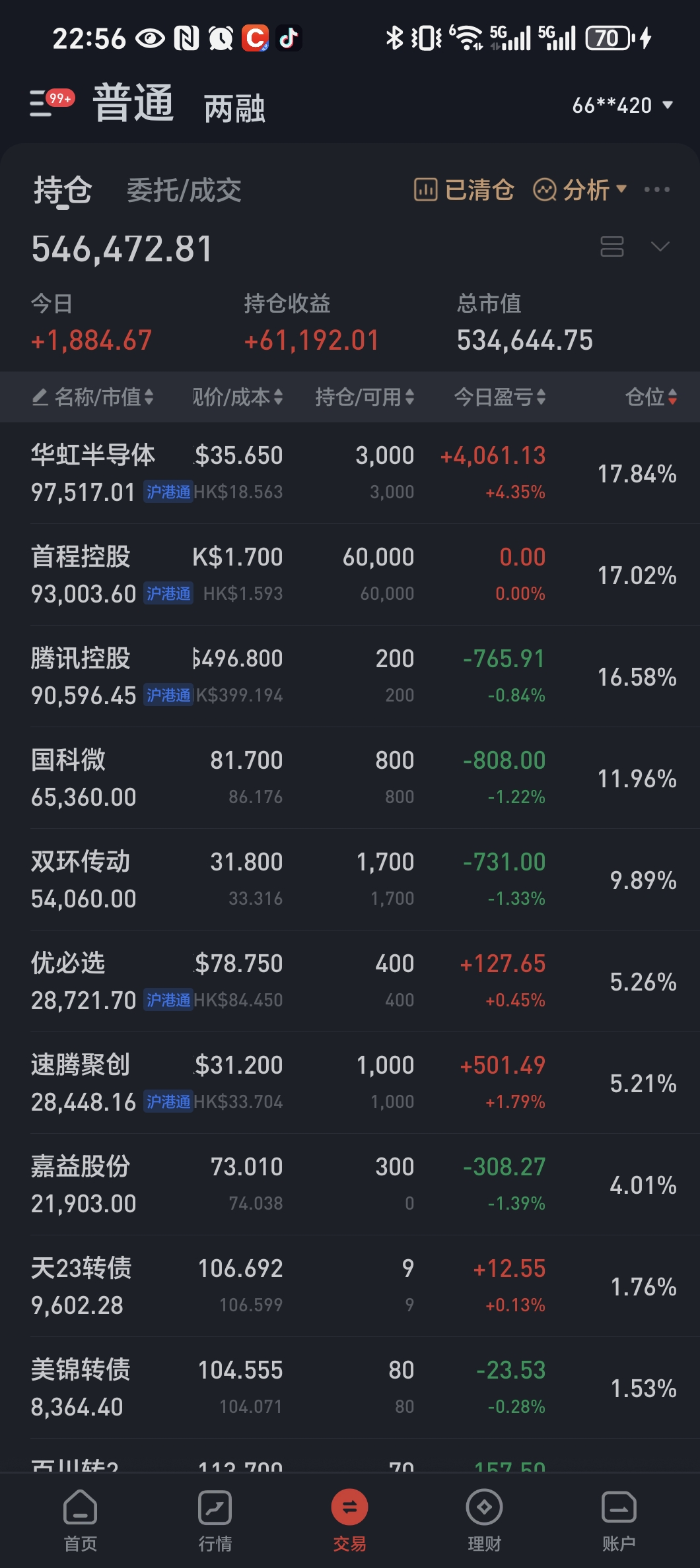 今日无操作,仓位约7.7成。持仓的腾讯小幅回血,分众和华虹H小幅回落。