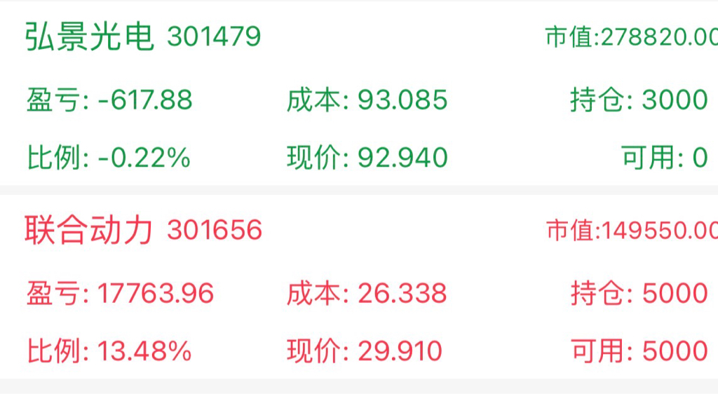 持仓:涛涛车业、观察仓弘景光电、观察仓联合动力。