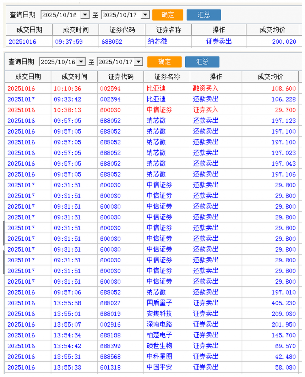 其实本月可以有很圆满的结局,10月16日,我在197至200的价位间清仓了满仓满融的纳芯微(顺手把历史遗留的零碎股也全部清仓了,基本都是负成本持有,当时想着考虑换家券商,所以全部出了),月度收阳线,年度创新高,完美!但是……不知哪根筋抽了,心血来潮,满仓满融分别买入中信证券和比亚迪,买入当天就觉得不妙,后悔不已,第二天(17号)一开盘就全部清掉了,中信没亏,比亚迪导致了主要的亏损,又把账户打回了原形。