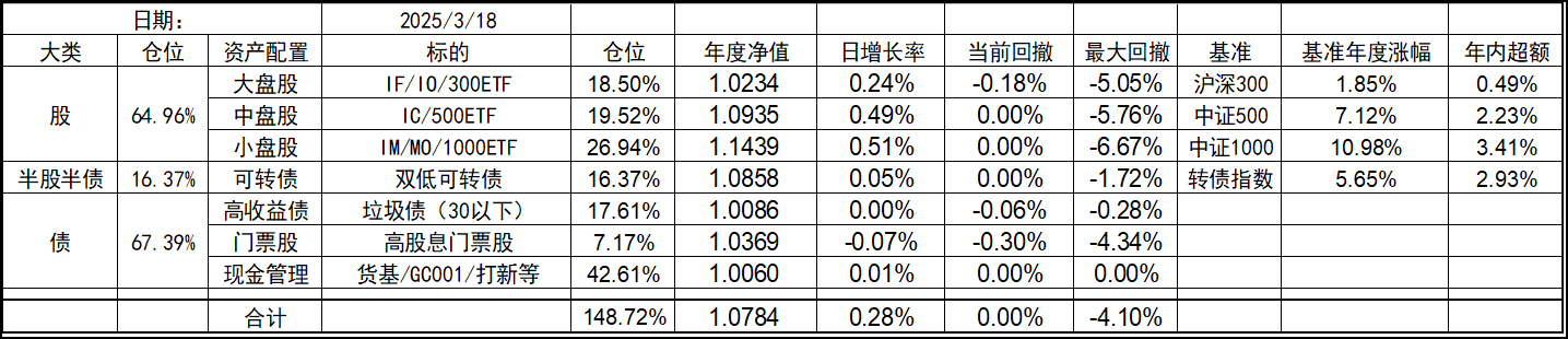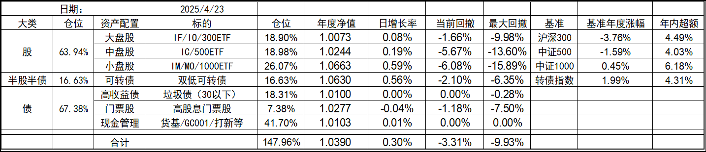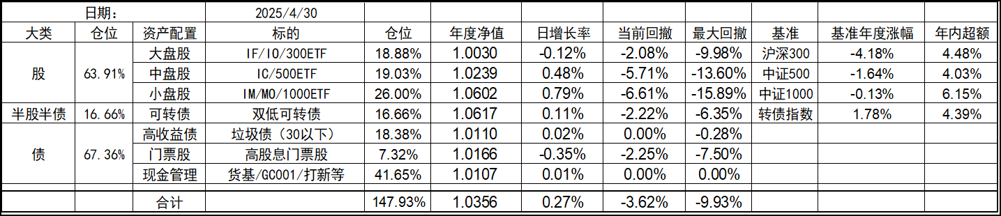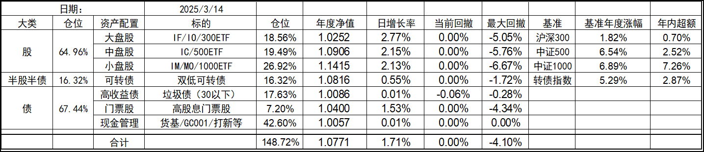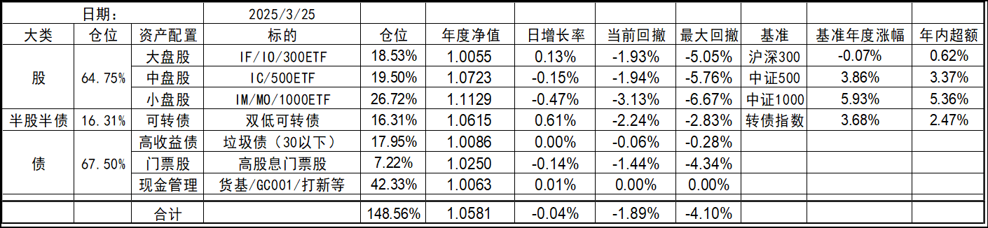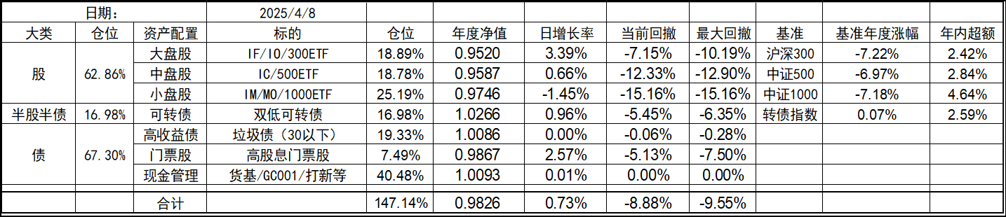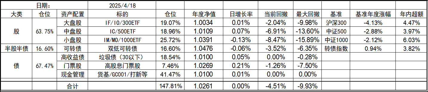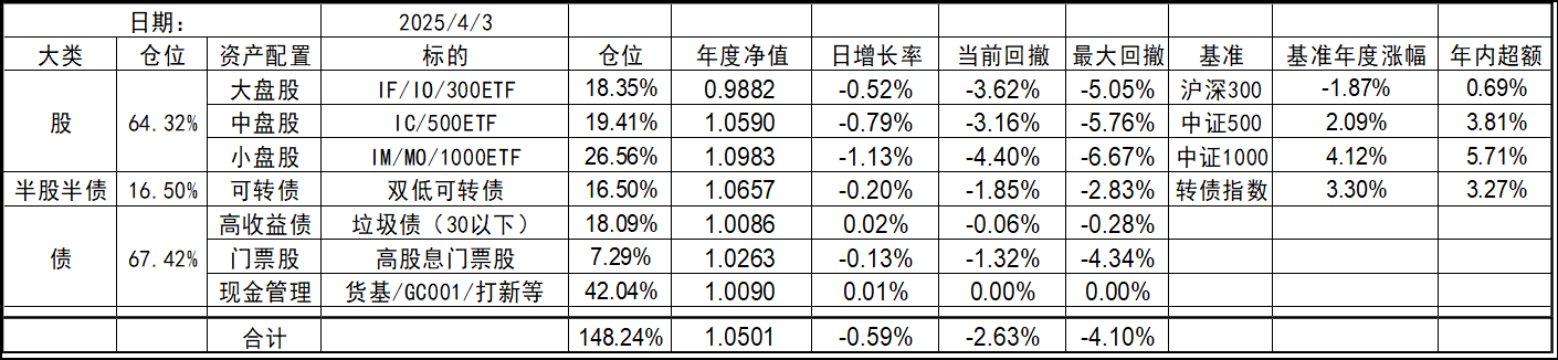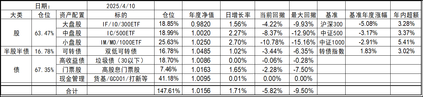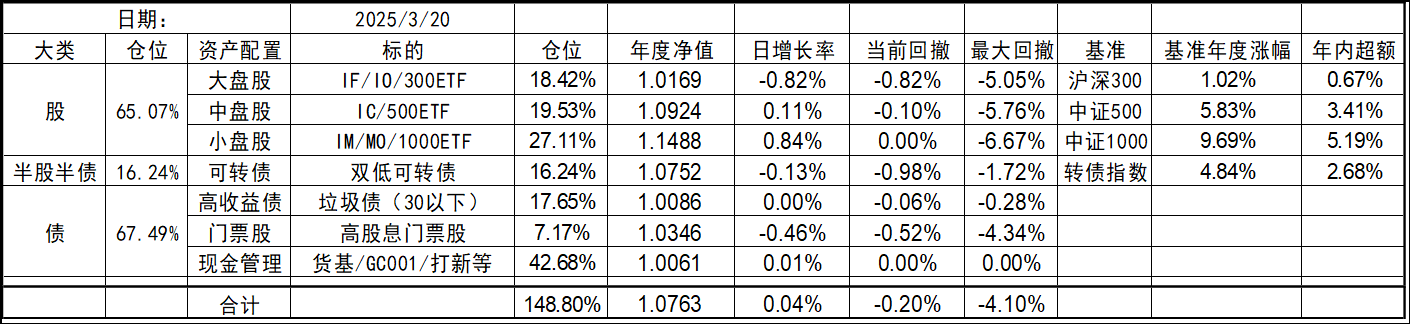 今年的持仓和去年底有些变化,北交所个股清仓,多数换成了代表中证1000的标的。这样持仓的资产类型优化到了7个,就当是7个葫芦娃了。同时利用垃圾债策略的闲置资金暂时归入现金。整体依然是坚持不择时、不深研选股的买入、持有、平衡、套利的策略,投研精力继续放在债端的各种低风险策略上。权益类等效仓位最高不超过100%,固收类则不超过80%,杠杆率控制在130%~180%之间。目前由于垃圾债推出部分现金的,现金的资产仓位处于高位,也给了一些指数下跌时加仓的操作空间,预计未来指数每跌10%会增加10%的权益仓位,直到杠杆比例接近上限,未来就看市场给不给这个机会了。