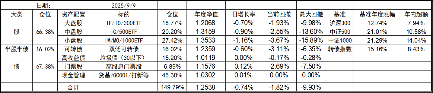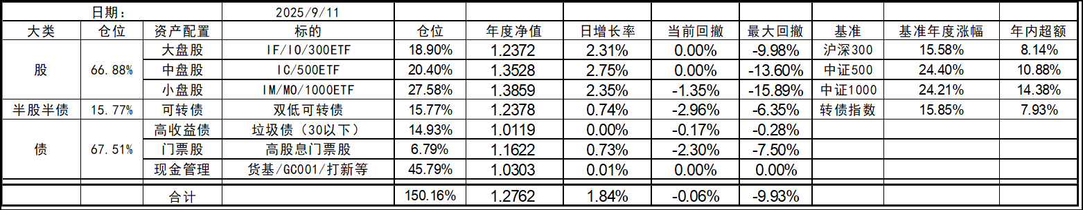 今年的持仓和去年底有些变化,北交所个股清仓,多数换成了代表中证1000的标的。这样持仓的资产类型优化到了7个,就当是7个葫芦娃了。同时利用垃圾债策略的闲置资金暂时归入现金。整体依然是坚持不择时、不深研选股的买入、持有、平衡、套利的策略,投研精力继续放在债端的各种低风险策略上。权益类等效仓位最高不超过100%,固收类则不超过80%,杠杆率控制在130%~180%之间。目前由于垃圾债推出部分现金的,现金的资产仓位处于高位,也给了一些指数下跌时加仓的操作空间,预计未来指数每跌10%会增加10%的权益仓位,直到杠杆比例接近上限,未来就看市场给不给这个机会了。