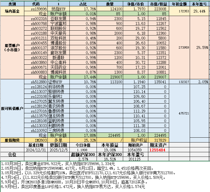 年初是三小转债,后来觉得要跌就切换到低价转债,仓位也降低了,结果证明我又错了。关于etf账户经常操作确实忍不住,好在也没太糟糕,也逐步实现年初的配置一些纳指的想法。纳指别择时了,我试过无数纳指择时策略,从来打不赢纳指,最多选低溢价和低费率的