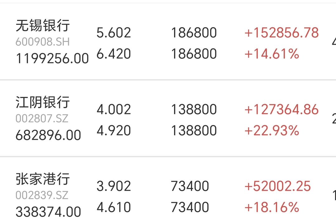 凌波大神确实厉害,我挑的三个银行无锡、江阴、张家港就江阴涨最多,赚了22.9%,张家港18.1%,无锡14.6%。自己拍脑袋买的冀东水泥亏2.4%。但是我有一个优点,就是善于抄大佬作业,哈哈。
