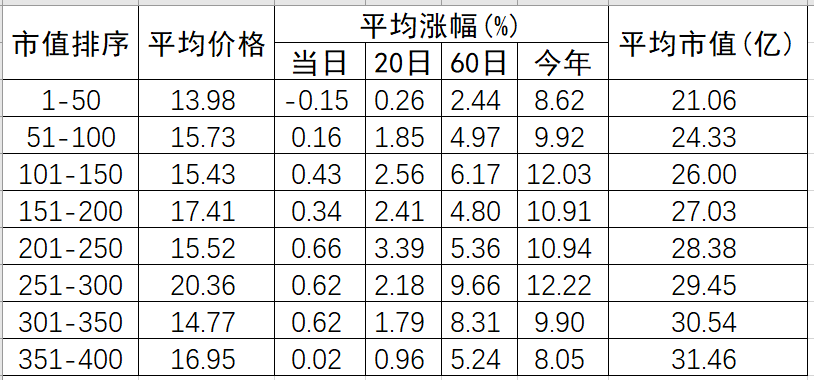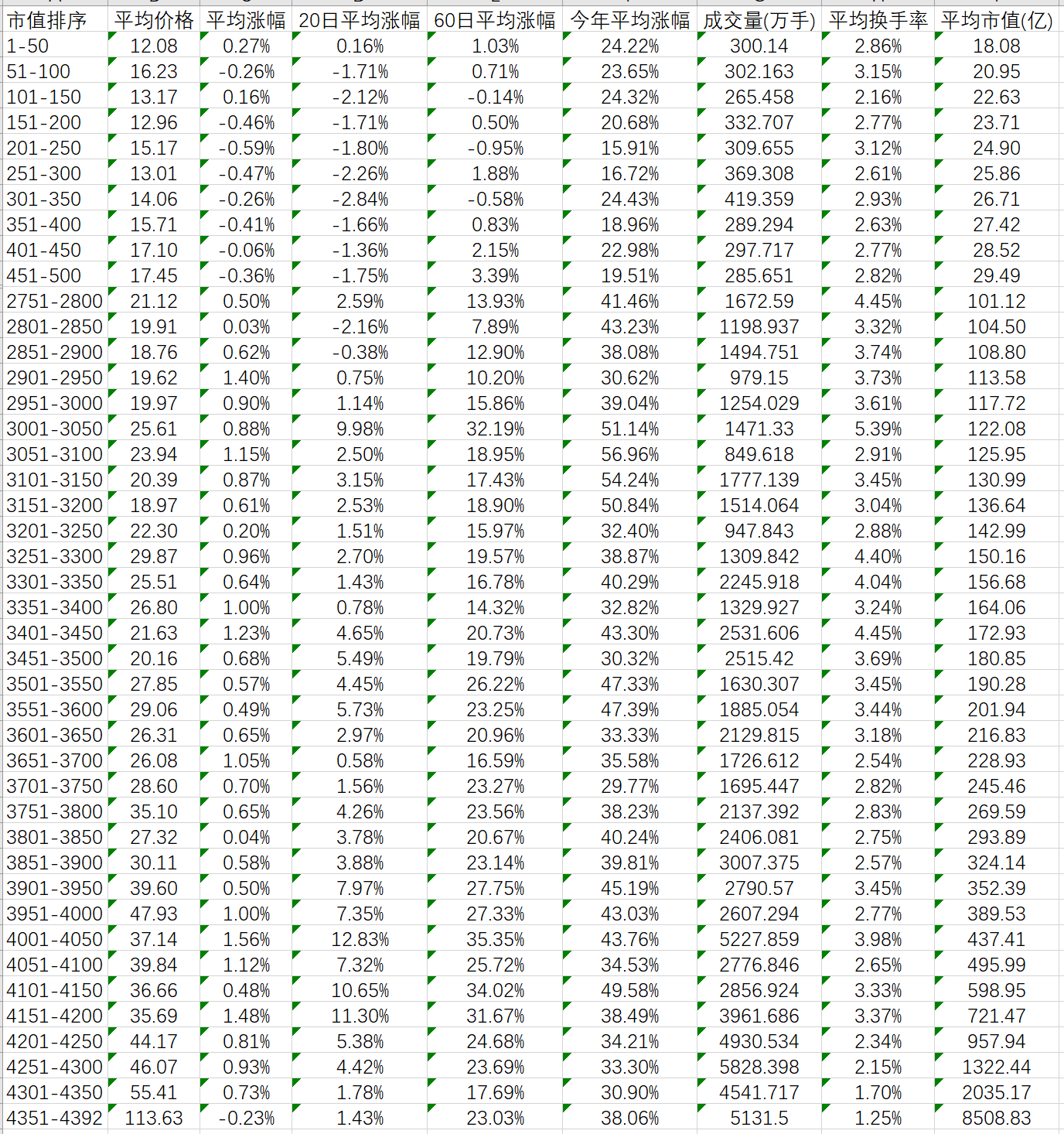 除去科创、北交所和ST,市值排序最小500和平均市值百亿以上,今年的涨幅情况: