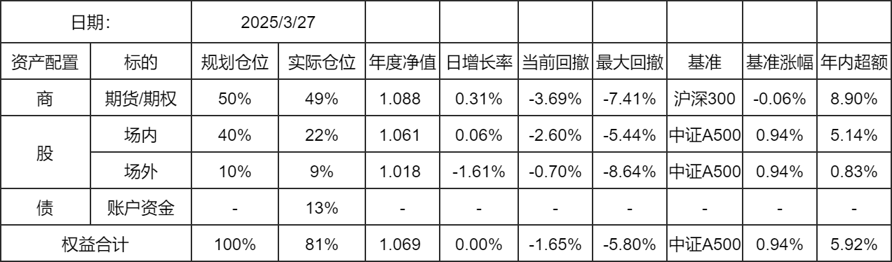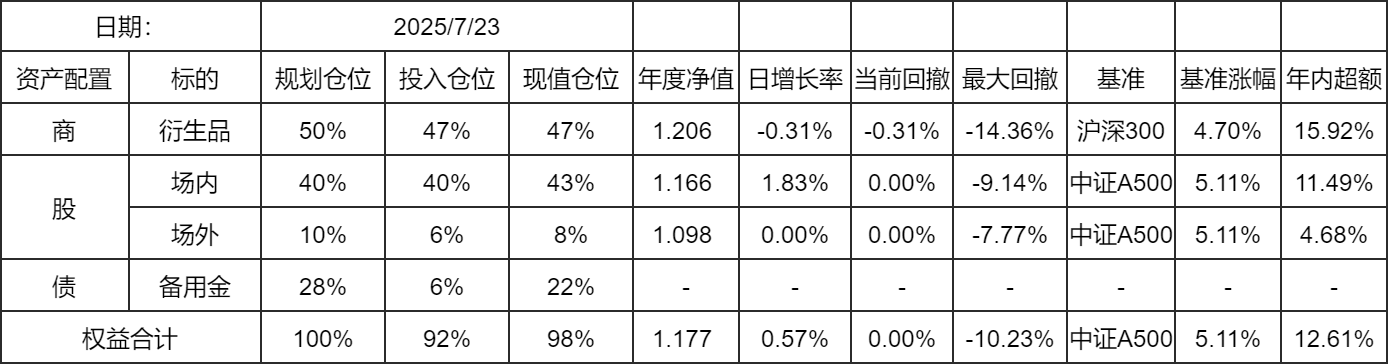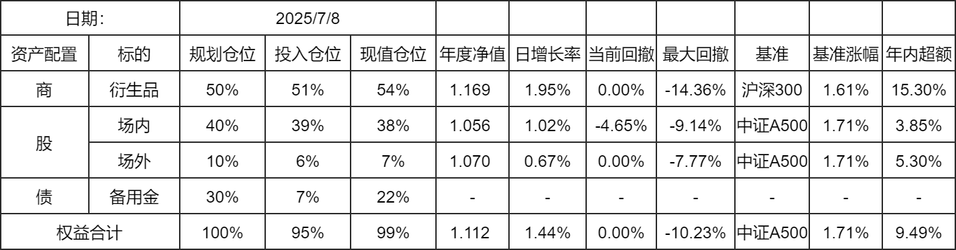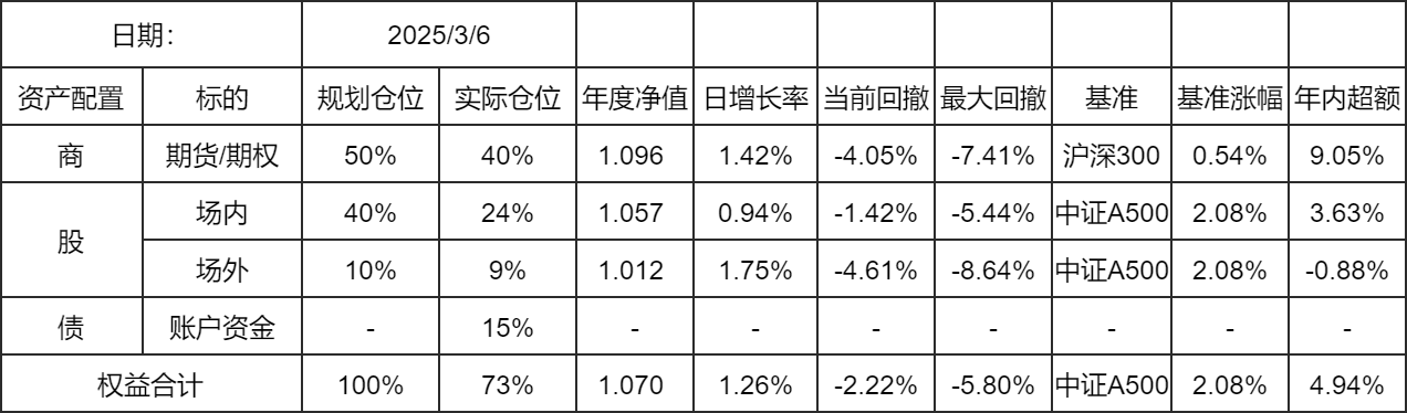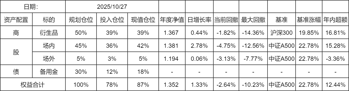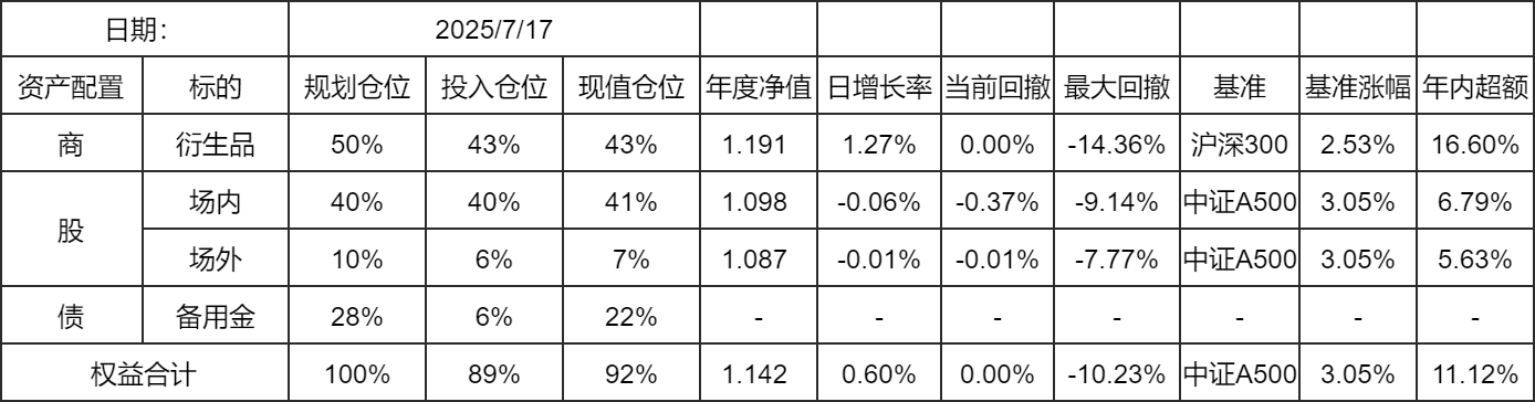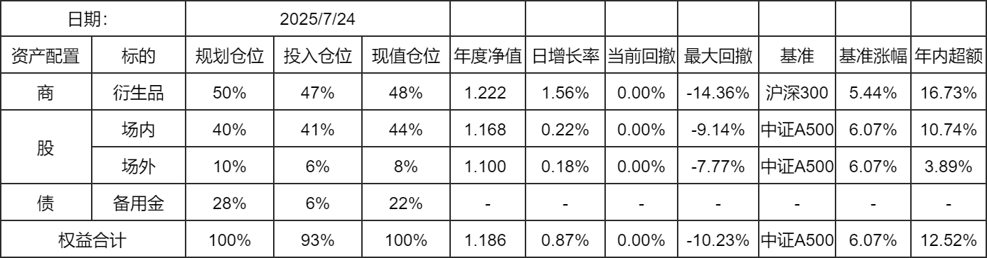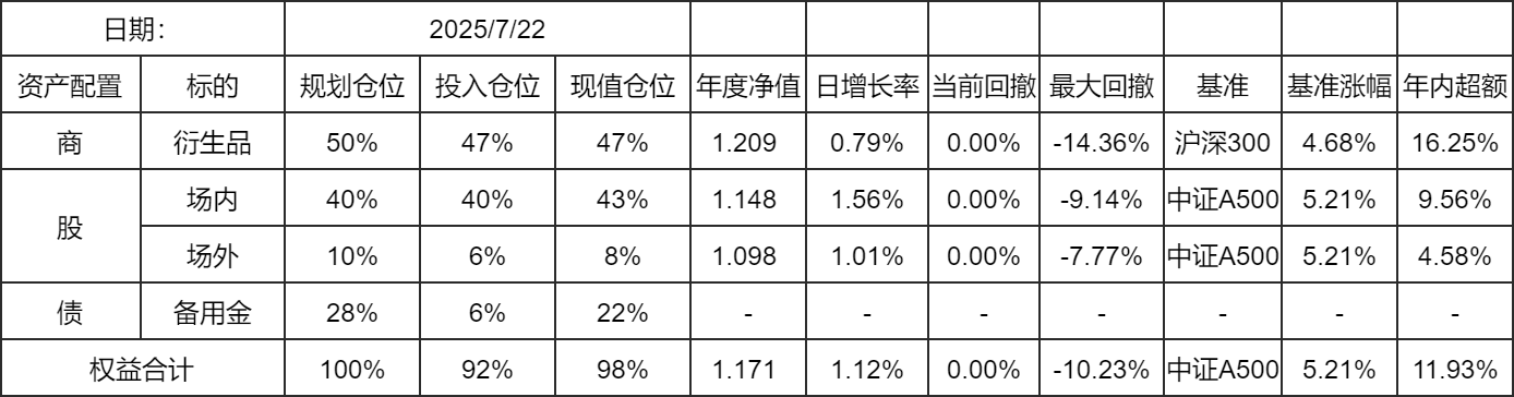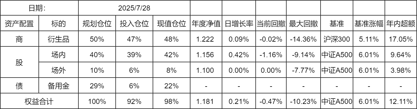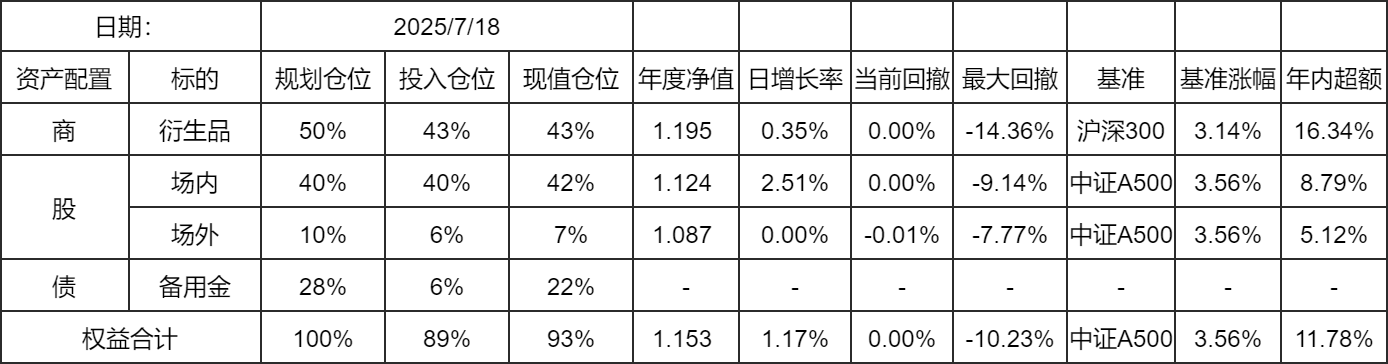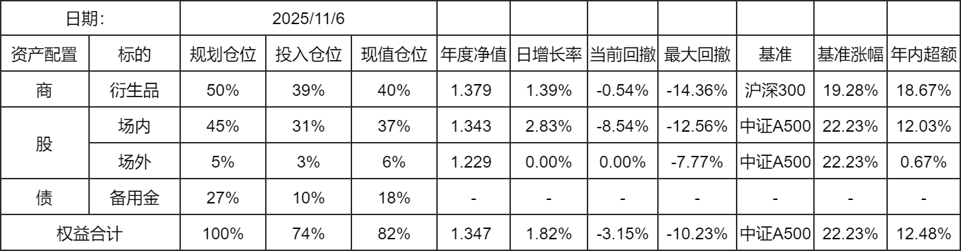 一周过去净值也创了新高,场内收益一般,衍生品还行,场内主要是香港市场,衍生品主要是大A,双轮驱动,就当做是此起彼伏吧,还不错