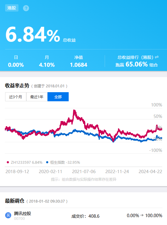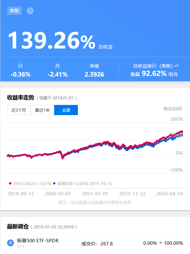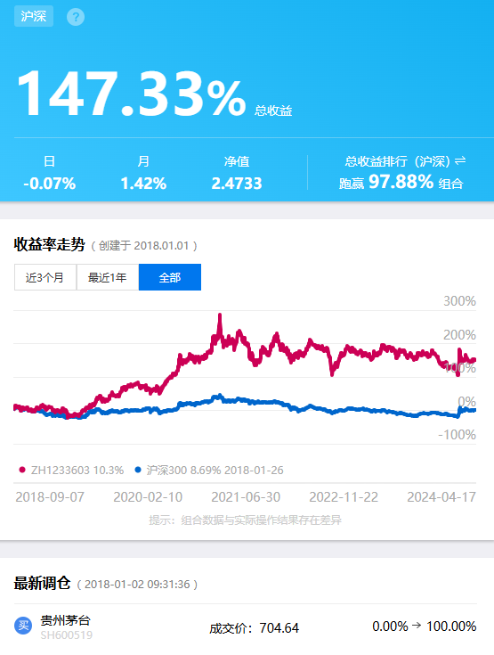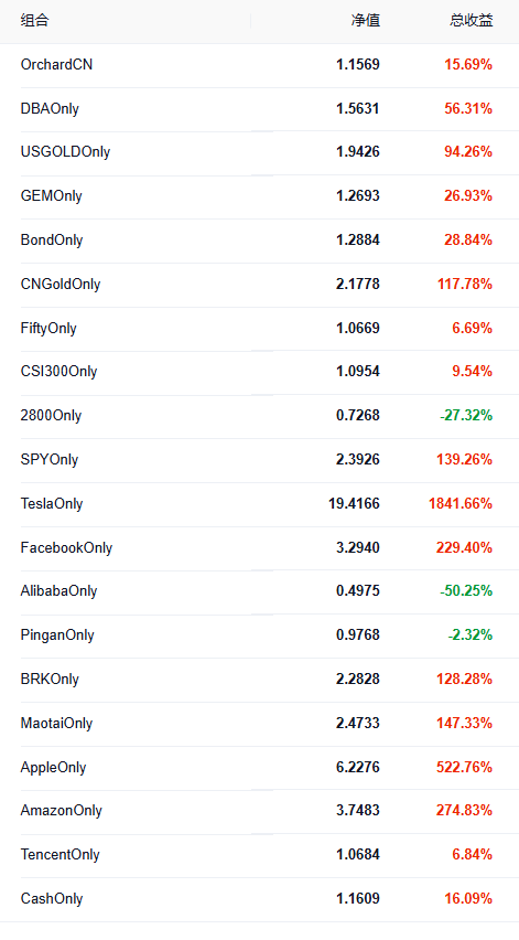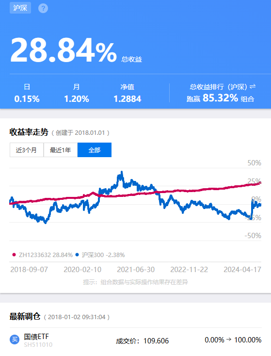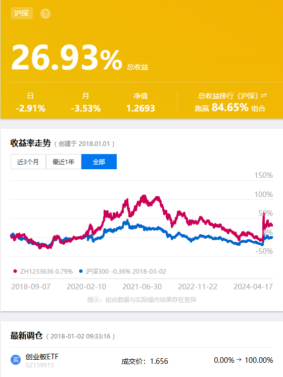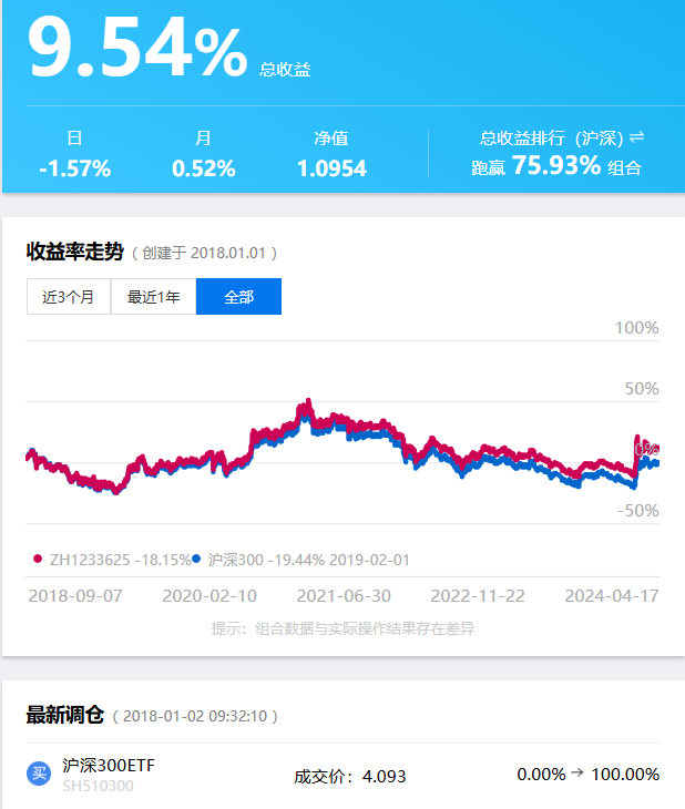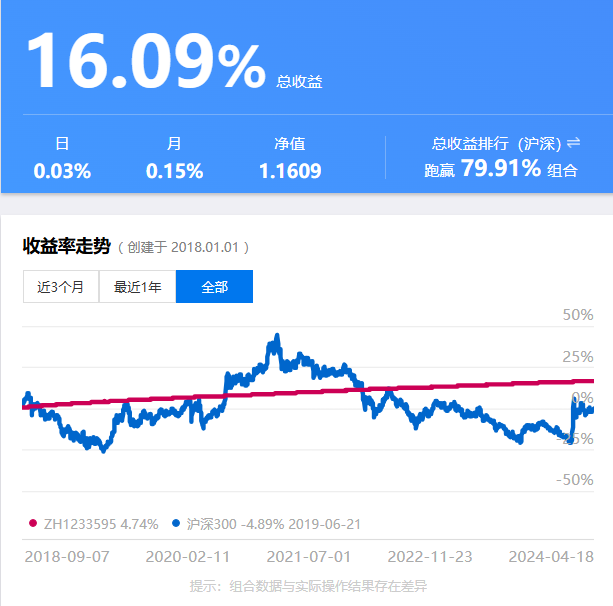 1.如果持有最简单的现金理财产品,银华日利ETF,回报是16.09%,战胜了大约80%的组合(我猜测多数组合的创建人在组合表现不佳之后,会关闭或放弃组合,所以这个比例不一定准确,但可能说明一些问题。更重要的是和之后列表的组合相互对照,因为它们都是同期的),这个现金组合曾在2021年2月的时候大幅跑输了沪深300指数 (当时8.4% 对 36.5%,时来天地皆同力,运去英雄不自由)。