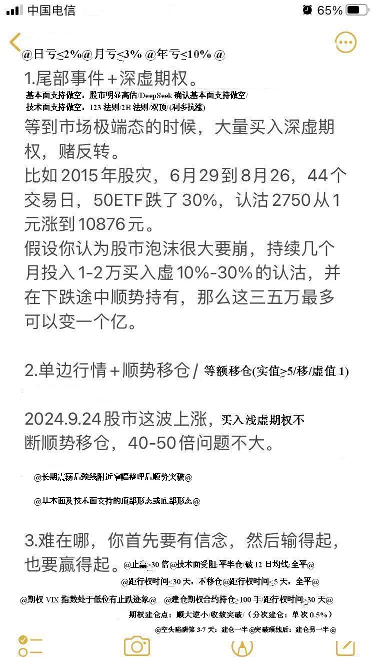 这几天又是跌的,已跌到上轮回撤的低点。还是没操作,持有没动。————上周征求一些优化建议,没想回应不多,感到有些意外。因为在我印象里集友总能给出一些极好的又极具启发的意见,尤其是刚来的第一年。于是,我又去翻了以前的记录,发现很有意思,有时感到好像不是自己写的。比如以前我每天整理表格,写市场情况,写改进方法,甚至写好次日的操作计划等等。这让我吃惊。我还发现一些连自己都想不起有写过的句子,像那时我就...分散与集中(只要不单吊小个位数)没有优劣之分,国内外都有成功的例子,适合自己的就好。你持有可转债、股票,ST股票(也算一类吧,毕竟相对退市的概率高些),期权,期货。没有爬楼翻你以前的帖子,若期权只是买沽防守就相对简单。另外四类都有各自的特性和操作方法,确实考验知识、经验、精力。建议记录每个标的(每个可转债,股票,期权,期货)交易策略(为什么开仓,调仓条件等等你交易考虑的因子),另外关注衍生品保证金充足。采用自己舒服并赚钱的方法就好!