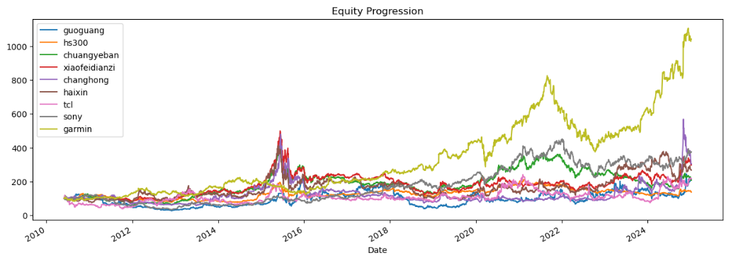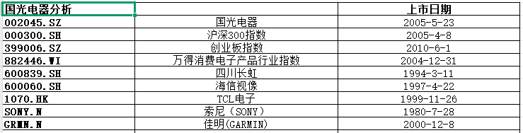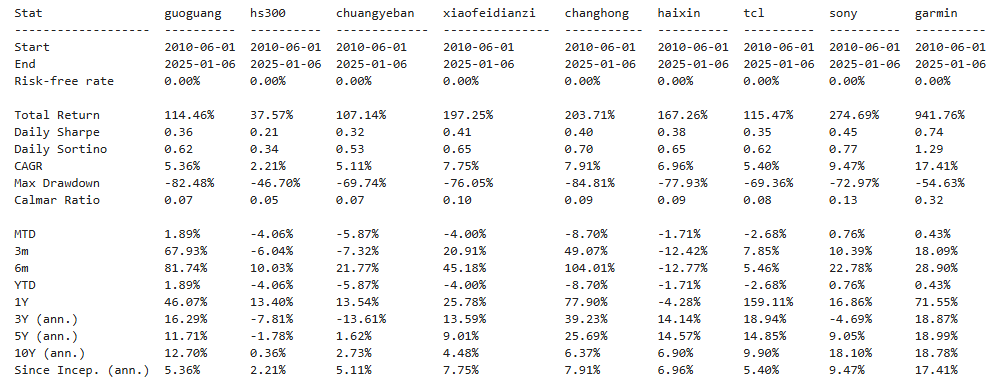 国光电器,基本面没啥亮点,历史表现也是拉胯,尽管目前估值不算高,但也没啥配置价值。整个消费电子行业历史表现略显平庸,波动也不低,夏普比率有点寒碜,不推荐,一定要配的话,美股看佳明,A股看四川长虹。