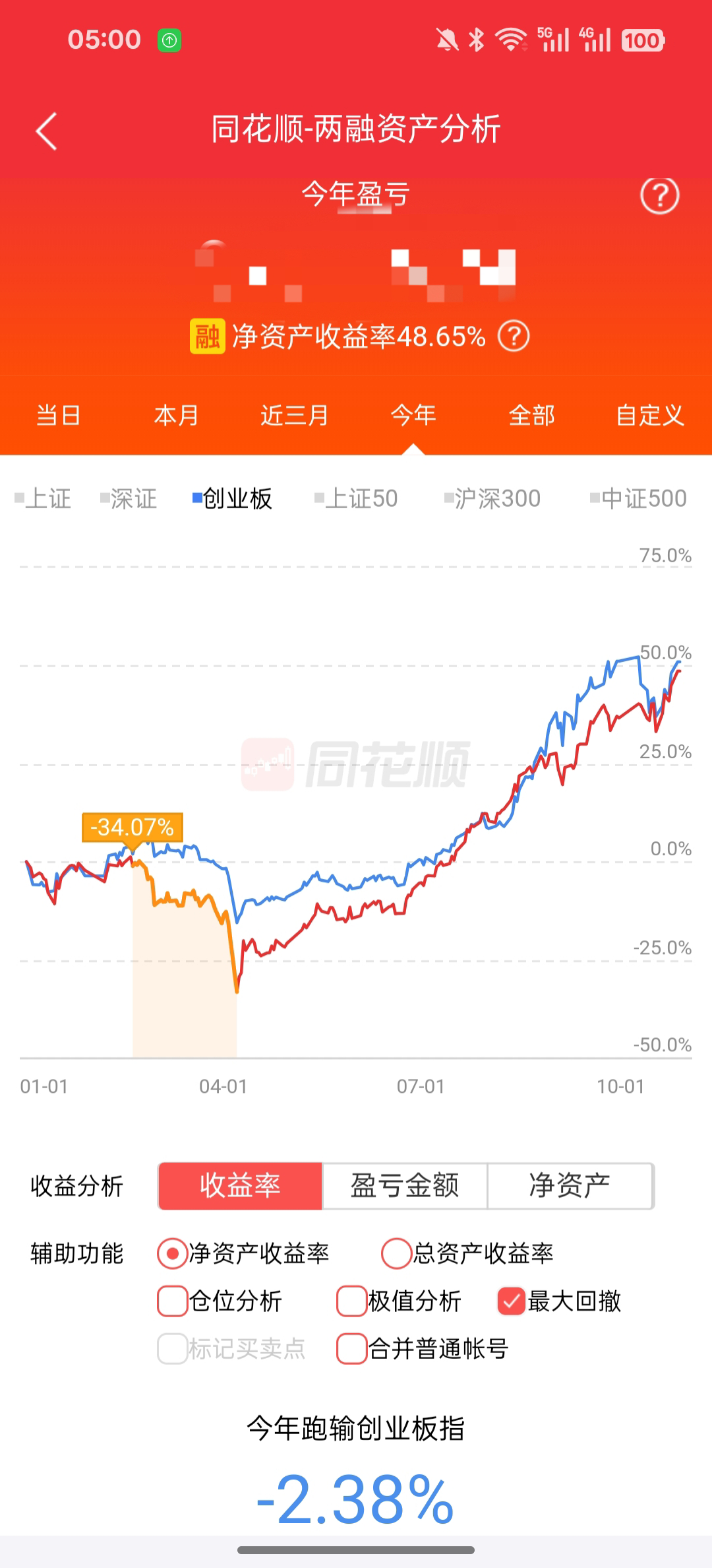 今年收盘,平仓,净资产收益率48.65%,勉强跟上创业板指,跑输2.38%,主要贡献是信息红利,