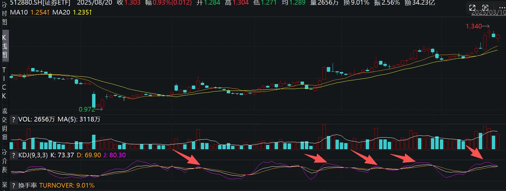 之前研究了券商的KDJ指标 MA均线择时,感觉效果不错,不过开仓次数太少了,样本不足,另外今天券商强势拉回,收了一根下影线,和之前走势有所不同,前几次创阶段新高后J线钝化加放量都是连续几天缩量下跌到MA10左右回弹,侧面说明今天市场的强势。