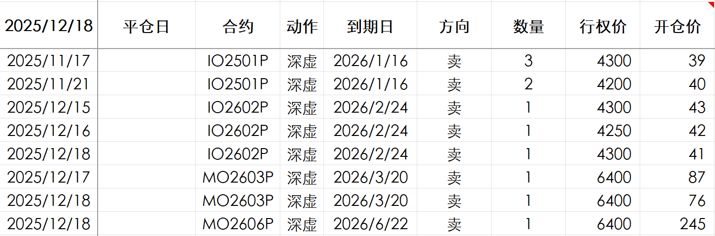 2025年12月18日:国家队护盘,我也顺便卖点put昨天疑似国家队护盘,300在4500-4550点,1000在7100-7200点,盘前看到美股大跌,觉得早盘有个低开,正好卖点。IO2602-P-4300,41MO2603-P-6400,76MO2606-P-6400,76 这一波卖put仓位差不多了,等后面再下来再卖点。你肯买,300我在你下面5%,1000我在你下面10%,who怕who...同意楼上兄弟的说法,没必要裸卖PUT,除非有准备接货。