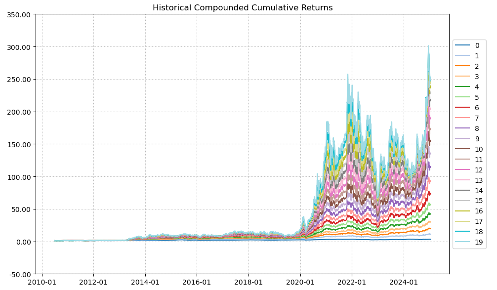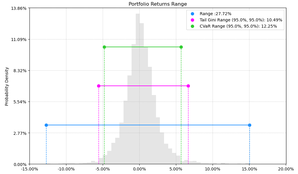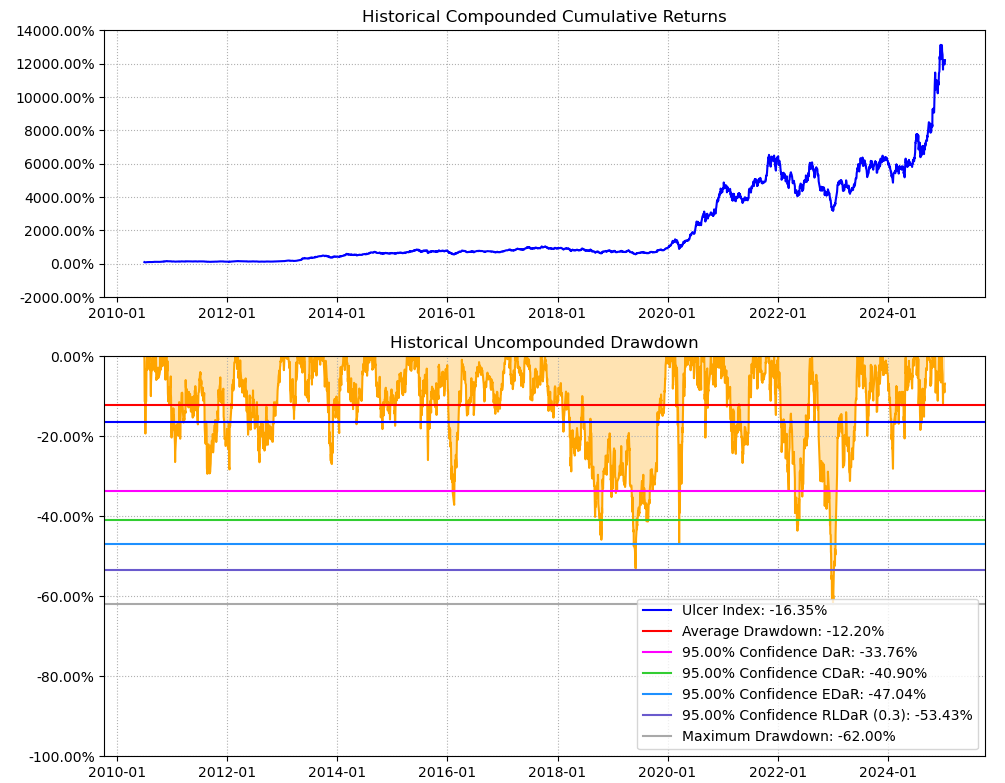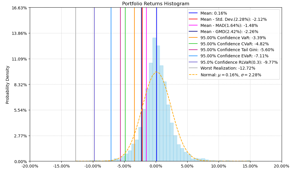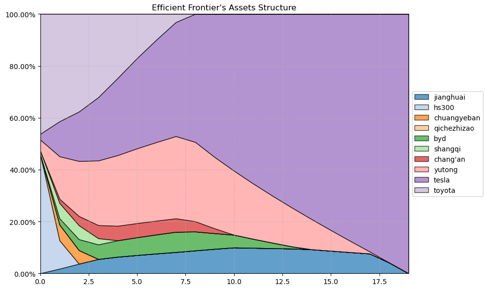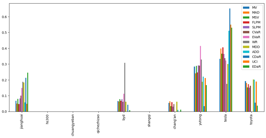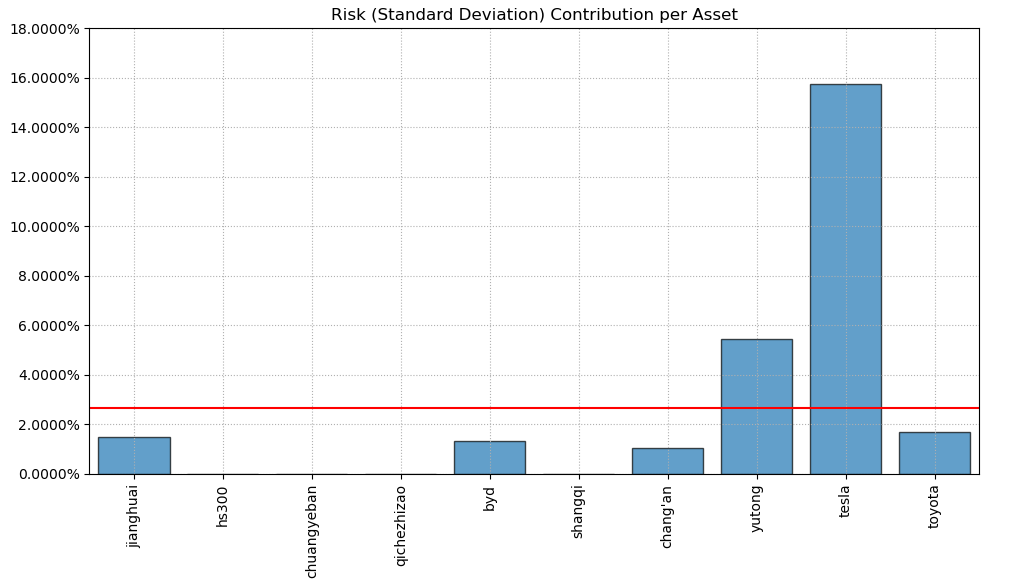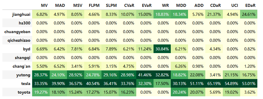 最后看下整个投资组合的情况,日度均值回报在0.16%,比上次测的汽车配件行业高130%,不过相应地12.25%的CVaR波动也会高很多。