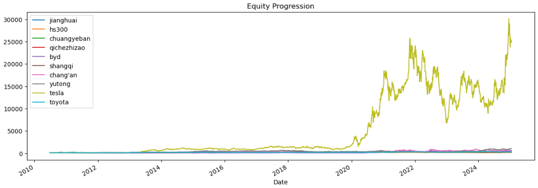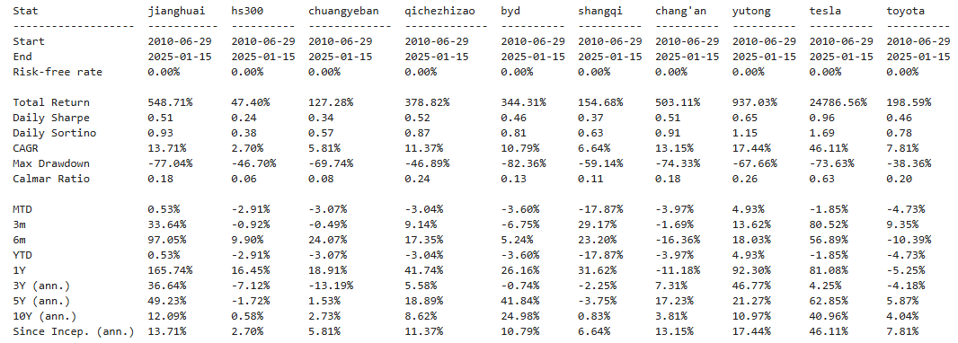 区间累计回报近140倍,最大回撤62.00%,投资组合的整体表现远好于江淮汽车个股。整个汽车制造行业盈利能力优秀,波动很大,夏普比率1.19表现优异。