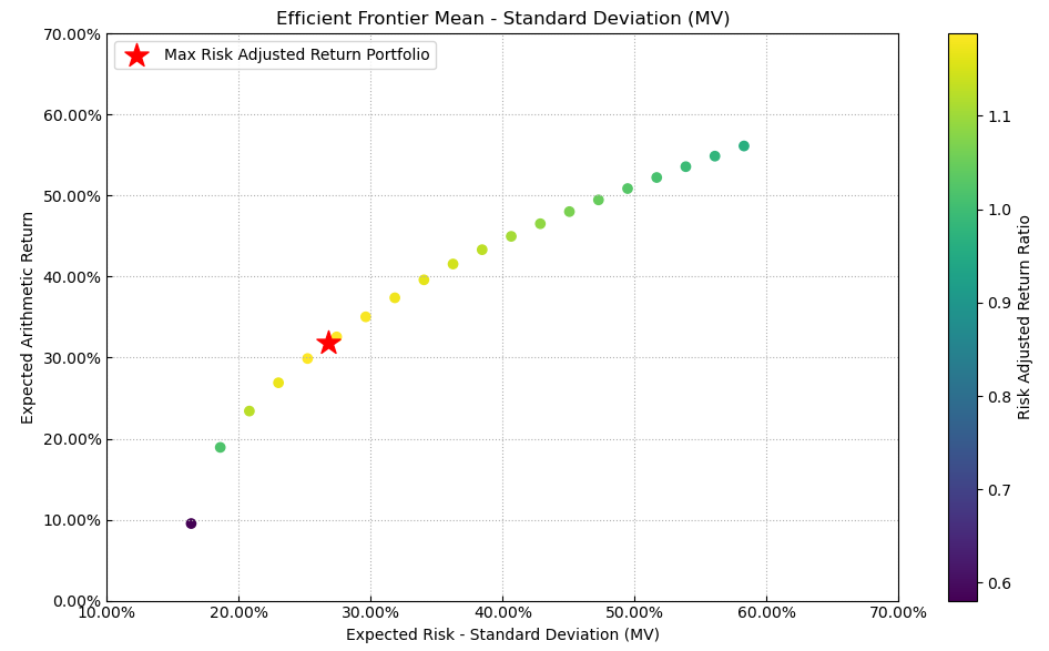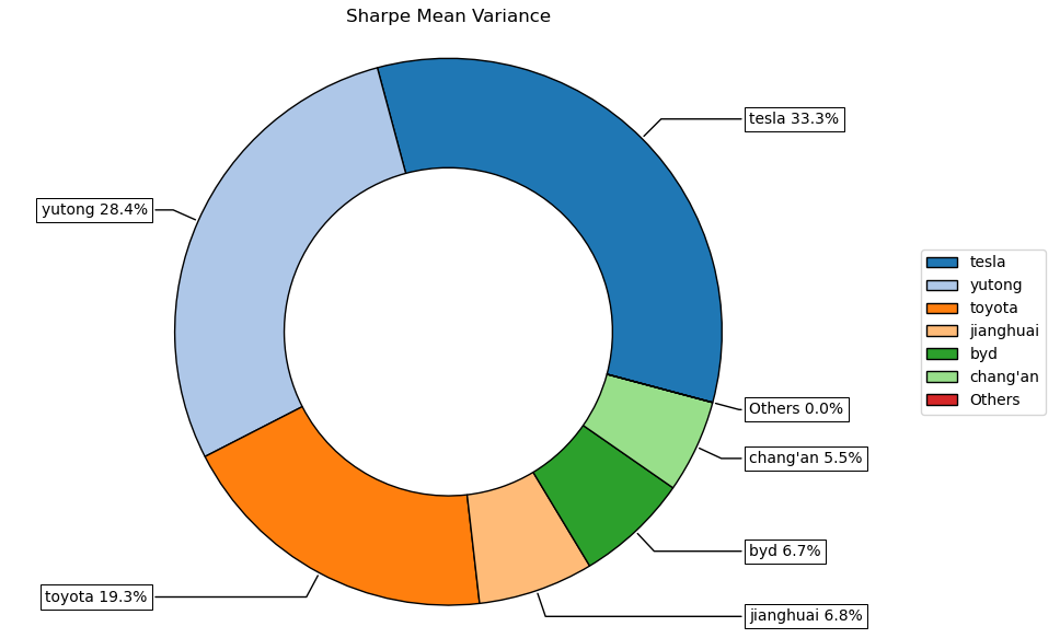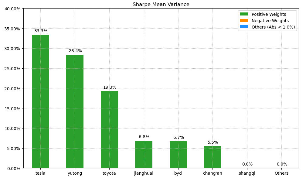 按最高夏普比率配置的话,系统给的权重为6.8,最大权重给了美股的特斯拉占比33.3%。