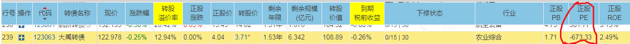JSL可转债列表里的PE不知道是怎么算的,很多都不对,有的相差十万八千里,例如123063正股近几年都没亏损过,怎么PE就成 -673 了?
