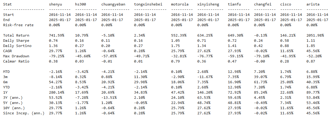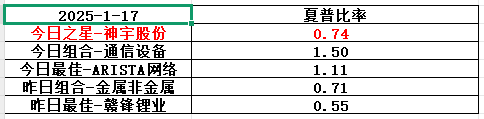神宇股份,基本面差强人意,历史表现不俗,但是目前估值太高了,建议等回调。整个通信设备行业历史表现石破天惊,但波动也大,夏普比率是目前已知行业里边最高的,值得重点关注,美股看ARISTA网络,A股看神宇股份。