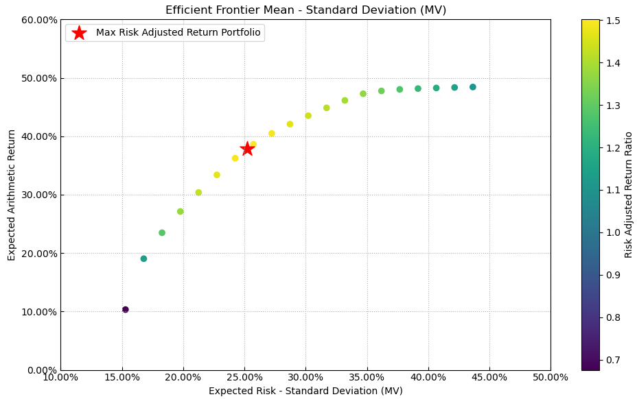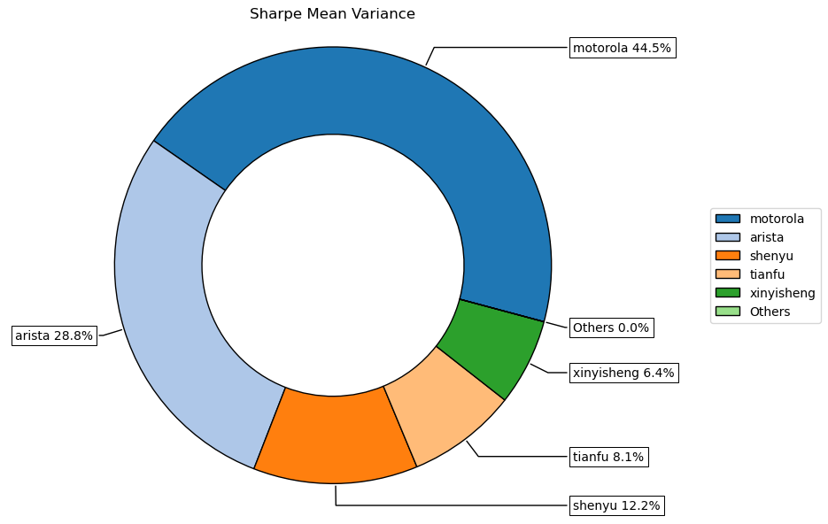 按最高夏普比率配置的话,系统给的权重为12.2,最大权重给了美股的摩托罗拉占比44.5%。