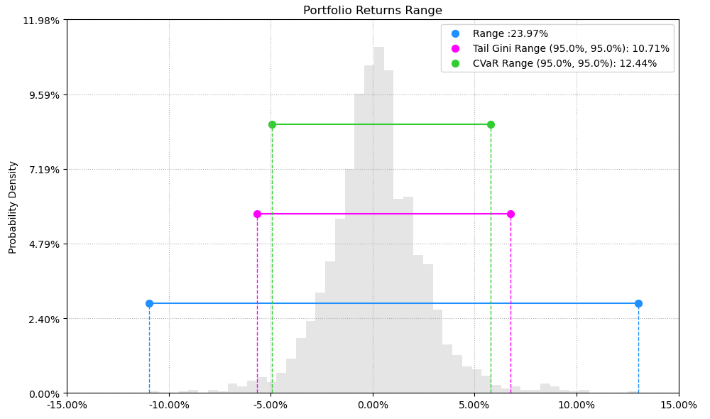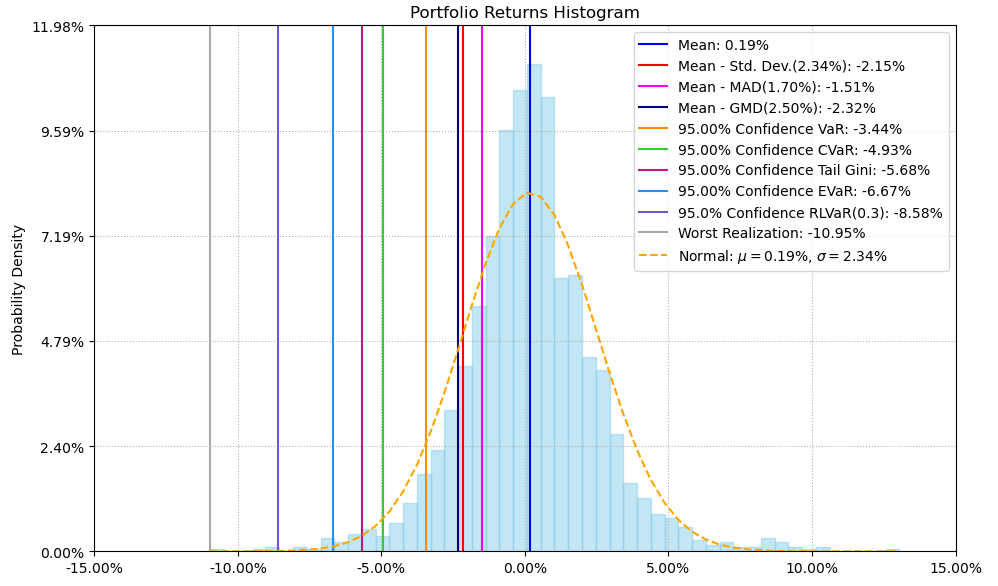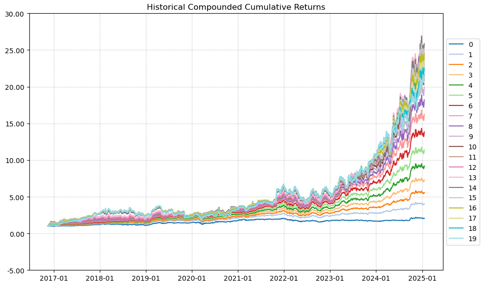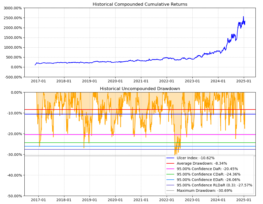 最后看下整个投资组合的情况,日度均值回报在0.19%,比上次测的金属非金属行业高140%,相应地12.44%的CVaR波动也会大一些。