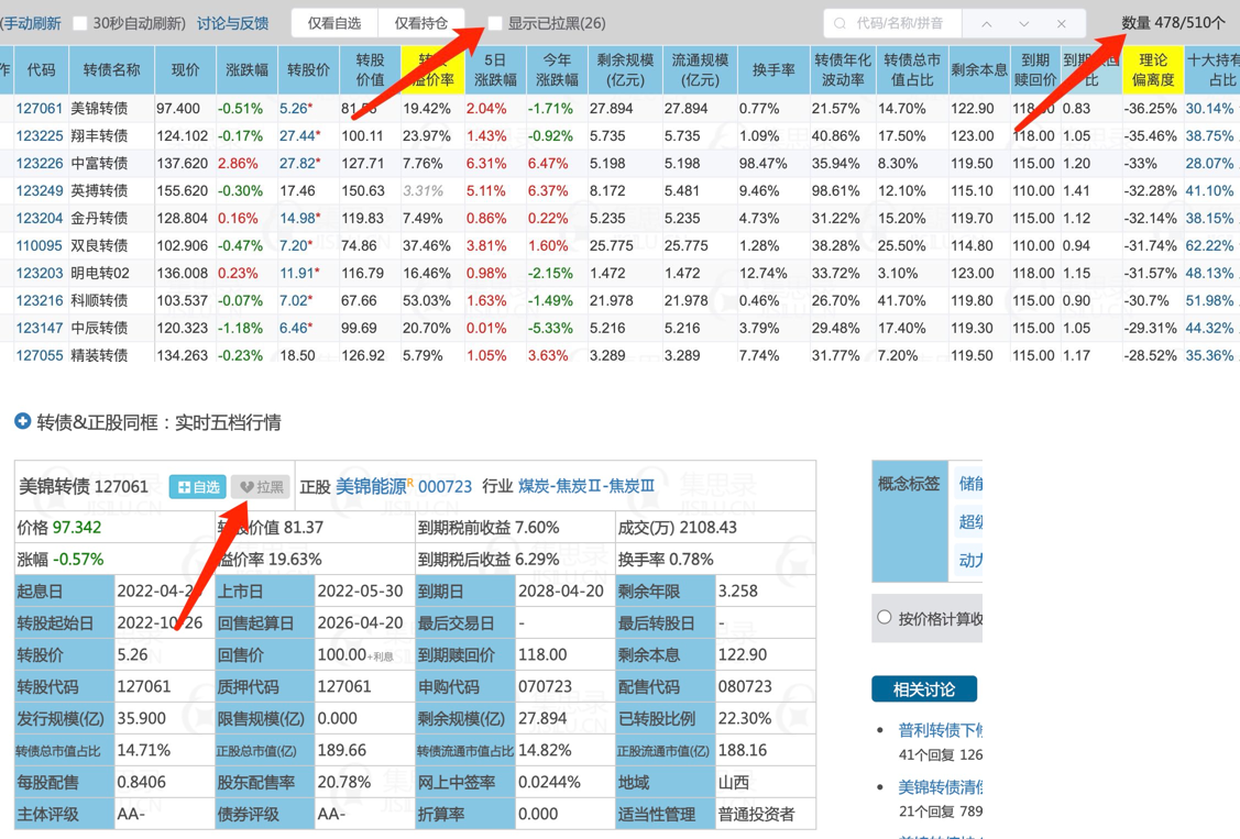 2 转债可以拉黑,把不再入您法眼的债券拉到黑名单里,大表里就看不到了