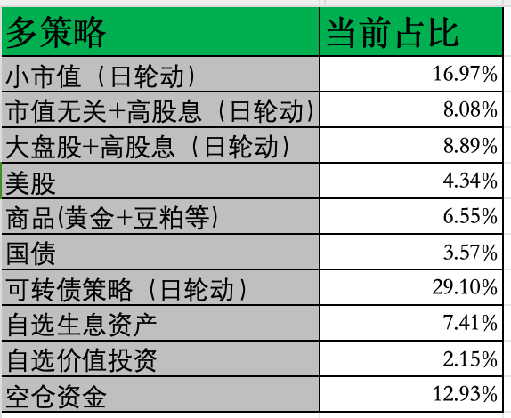 楼主有四个日轮动策略,分别是小盘、大盘+高股息、市值无关+高股息、可转债策略,这四个日频应该都是量化策略,占比达到了70%;剩下30%是主观配置可以这么理解吧。