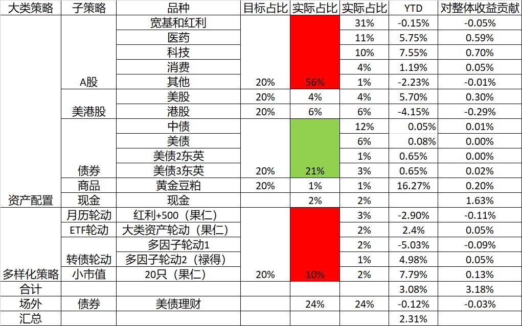 港股资产整体从8%降到7%,仍然超配了2%,港股最近涨太凶了,没有加仓但市值比例蹭蹭上涨