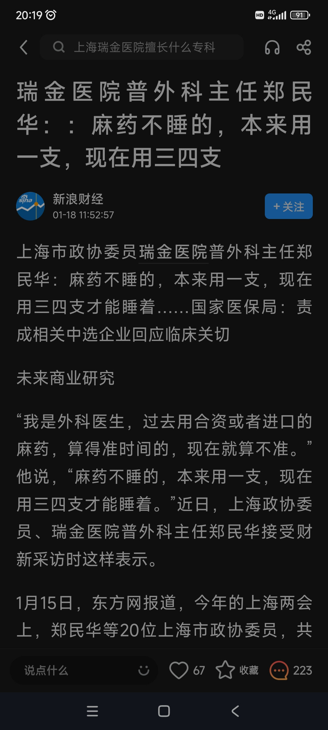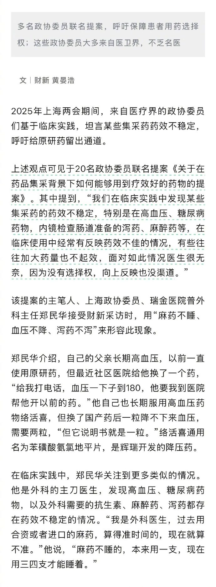 今年上海两会期间,郑民华接受媒体采访时表示,国家药品集采对降低医保和老百姓负担起了很大的作用,但在这么低价的情况下,药物质量可能不稳定,老百姓、他们医院和医生感受到的情况是“抗生素过敏、血压不降、麻醉药病人不睡、肠道准备的泻药不泻或者量不够”。