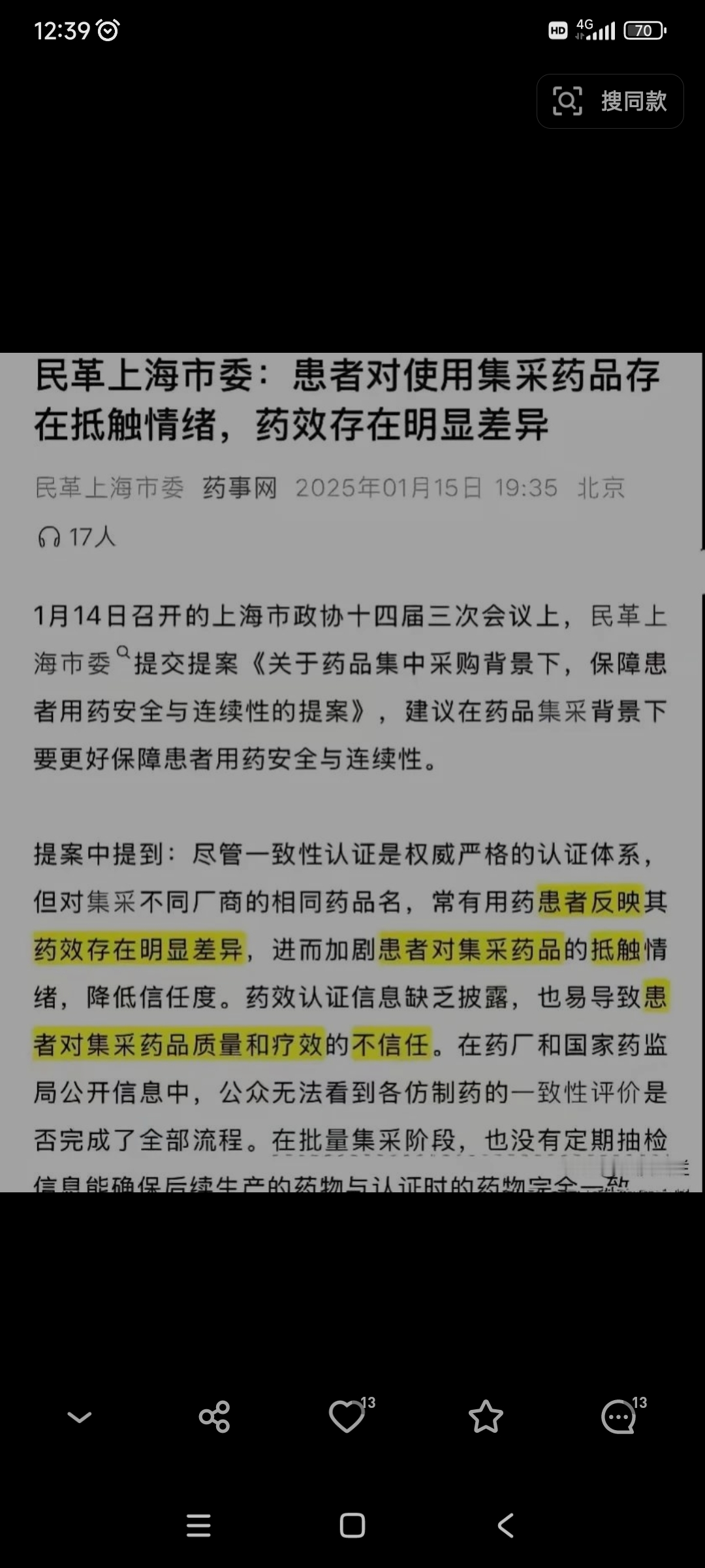 早就有所闻,做医生的同学也隐晦地表示这是事实。 集采药虽然便宜但我不敢用,情愿网上买贵一点的原研,不想因小失大