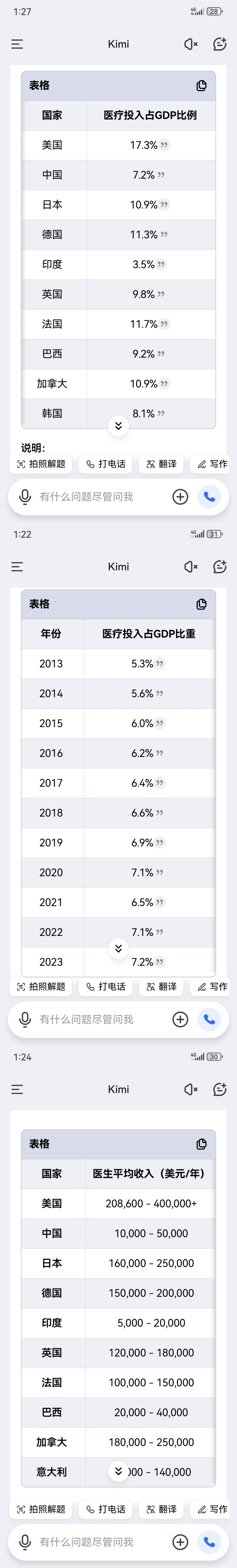 看到部分帖子要拿医生和农民工比表示震惊,对医疗系统稍微有点了解的都不会再质疑医生收入偏低这个观点。kimi 上随便一问就知道了。大家对医疗服务不满意是能理解的,根因不在医生和医院,而在于医疗投入占比,2013 年占比 5.3% 到 23 年 10 年了 才到 7.2%,投入少服务要高是个悖论,医生整体上是半公益性质提供服务。集采搞到现在这个地步就是个笑话,抛开仿制药一致性效果不说,医疗用材大砍价...刚上回家的列车,准备抽空罗列一下具体数据,感谢帮忙回复。主要的根源也在于zf对于医疗的投入不足,而且yq三年浪费了太多的资源。,医护工作人员付出了难以想象的艰辛。现在有不少qy欠账还没有完事。zf也兜不住了