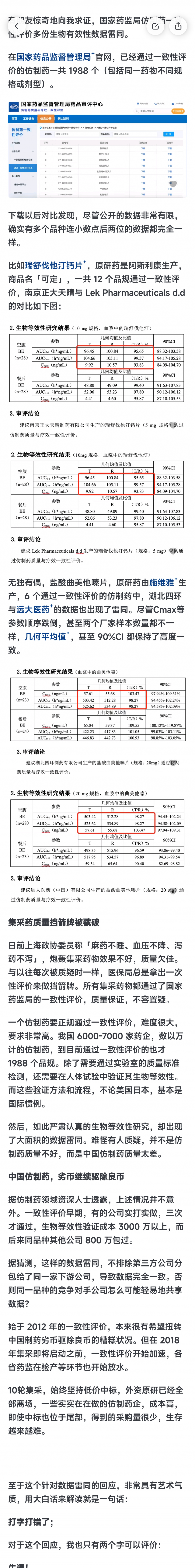 最近有人在药监局网站上发现一致性评价多份生物有效性数据雷同,这是药监局的正面回复。目前中国6000-7000家药企,数以万计的仿制药,而通过一致性评价的仿制药也才只有1988个。如此严苛的标准下,还能出现这么离谱的事情,难怪会有人反应仿制药效果不好了。因为劣币驱逐良币,实打实做的药企竞争不过投机取巧的药企。这一看就是局里编辑上传出问题了,竞速赛谁会把自家数据给“友商”用
