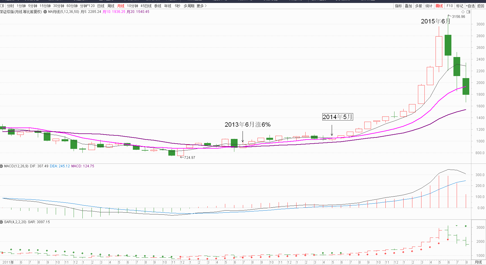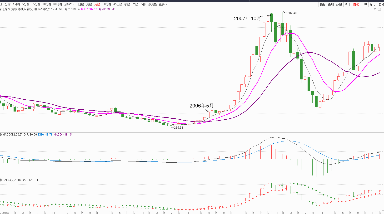 第二次,2006年5月涨幅17%,10和20月线金叉,此后没有深度回调,一直沿着5月线上涨。