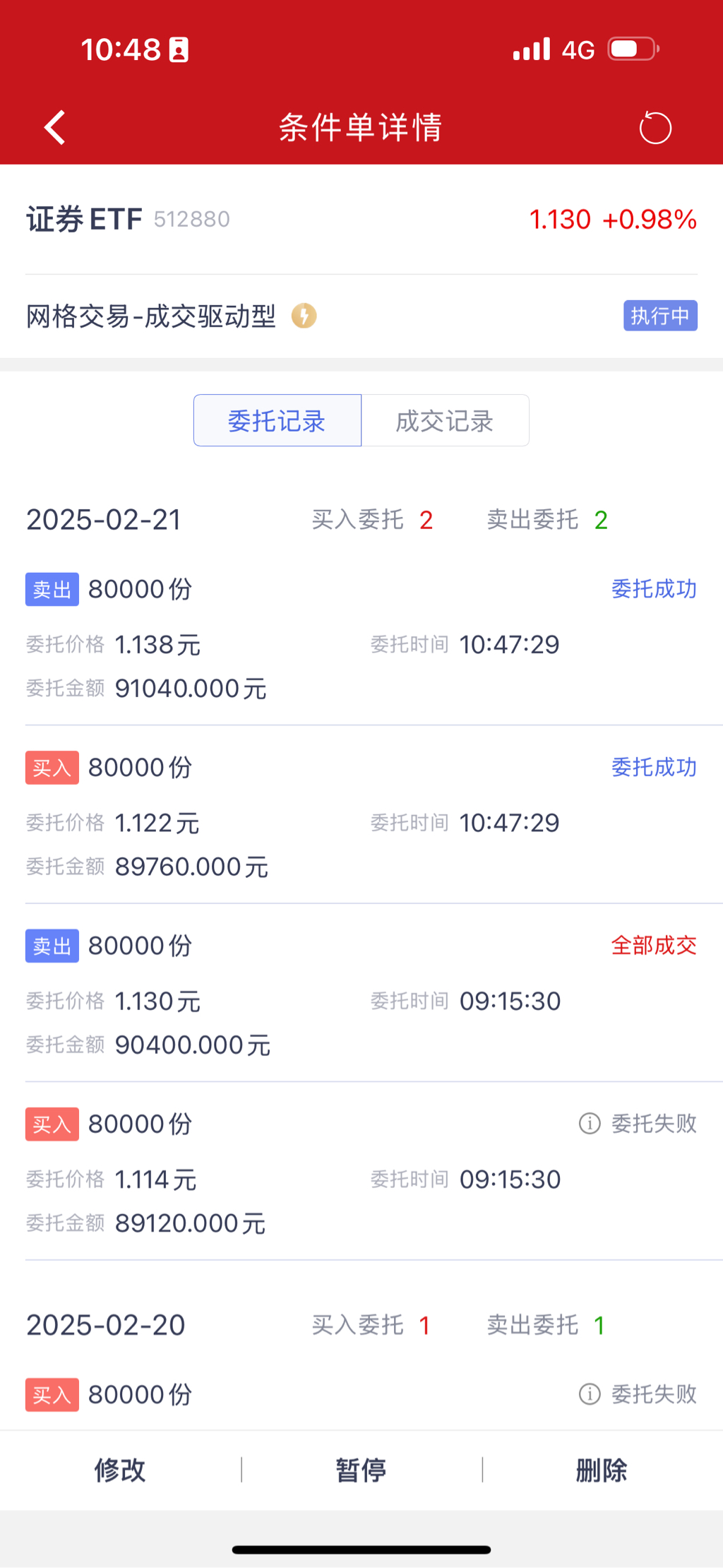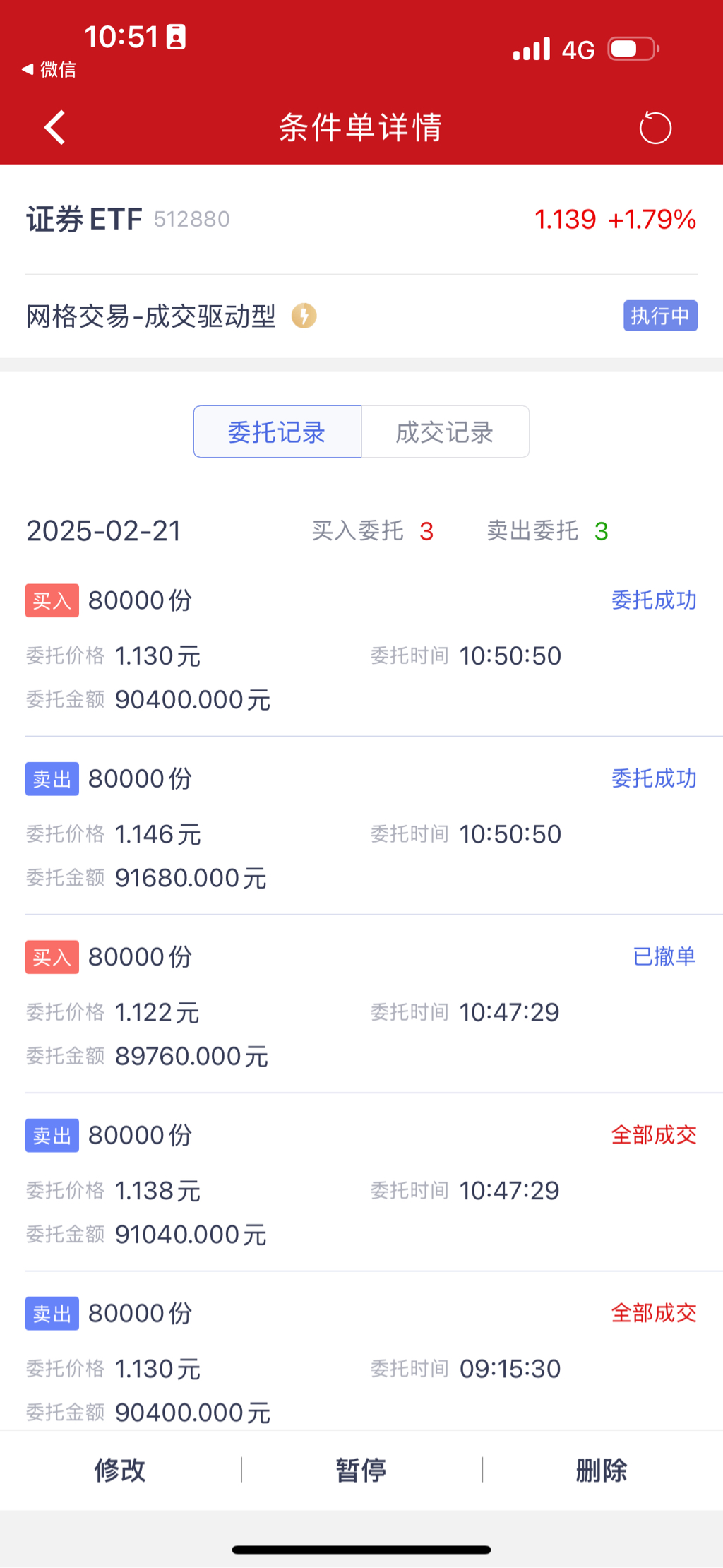 往后,我决定坚定不移地按照0.8分钱的价差,在银河证券开启网格交易,让其自动执行,不再过多纠结。证券ETF价格再度下跌,着实令人有些郁闷。不过换个角度看,如果一直让它自动进行网格交易,就能省去盯盘的麻烦,节省出时间去做其他事情。
