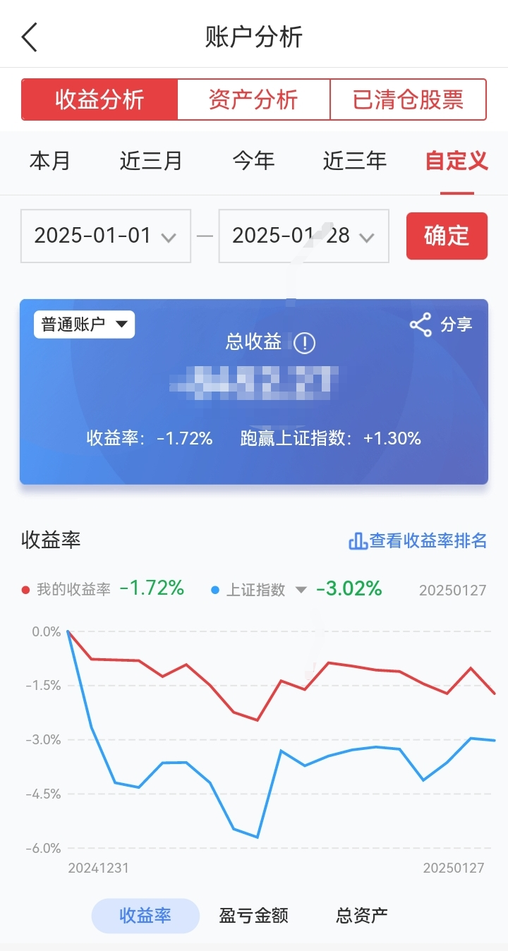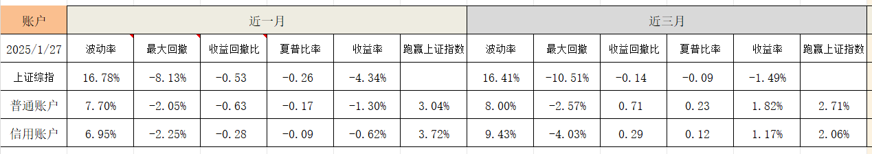 2025年1月账户综合收益率-1.03%,跑赢上证指数3.25%。波动率7.47%,最大回撤-2.11%,均远好于上证指数。