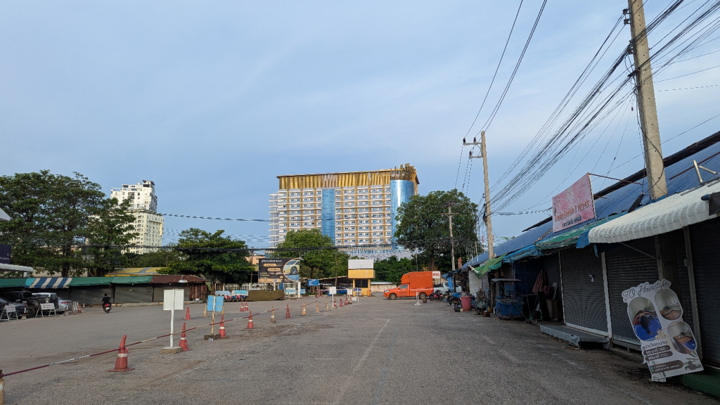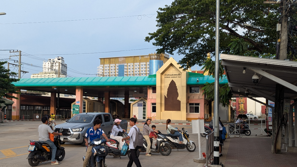 特意驱车6公里去沙缴和柬埔寨交界的边境去体验一下边境文化。上个月因为边境冲突,洪森短暂的关闭了沙缴的边境,但两地务工人员太多,抗议猛烈,据说重开了,所以特意去查实一下。我们到的是17点多,那个时候边境还是关着的,问了周围的人,英语都不太好,也不知道平时还开不开,至少我们去的时候是关着的。边上最大的一个购物中心star plaze也关闭了,不知道是因为边境冲突,还是早关了。