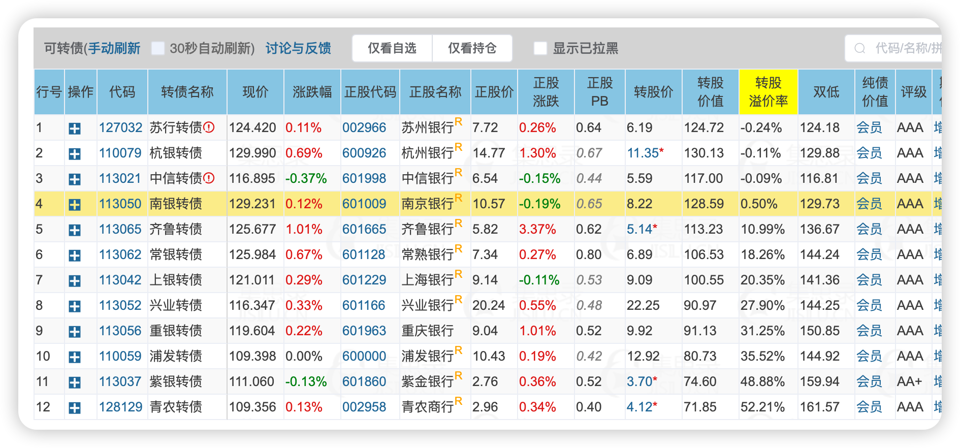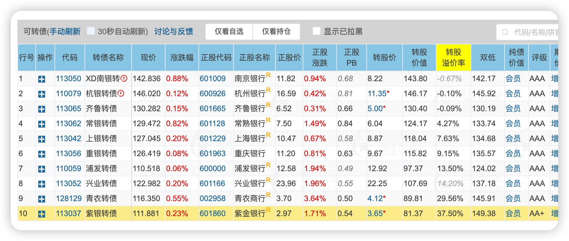 所以银行转债要么低价,要么低溢价率,要么二者兼而有之