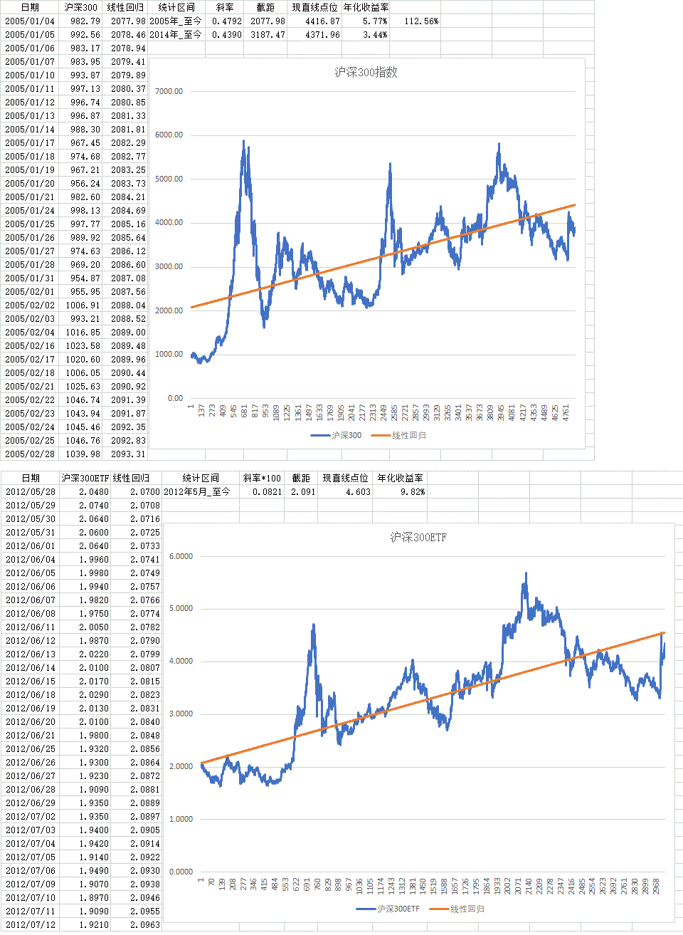 找到了2005年的数据,沪深300收盘923点,市盈率14.28倍,相对每股收益64.6。2014年沪深300收盘3534点,市盈率12.91倍,相对每股收益274。未来收益率会越来越低,因为中国再不进行大的制度改革,中等收入陷阱基本出不去了